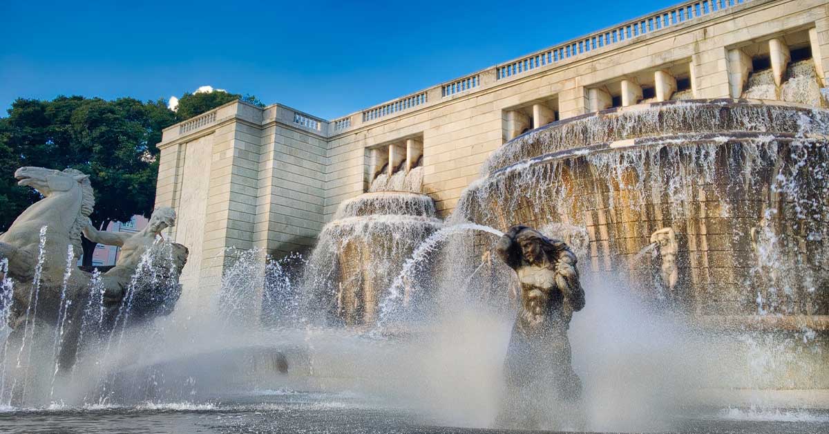 Located at the centre of Avenidas Novas, Fonte Luminosa was built in 1940, when the world was at war and Lisbon was at peace. This fountain consists of a wide basin into which water flows from the top platforms, as well as a number of statues, being them Triton on a horseback and four mermaids.