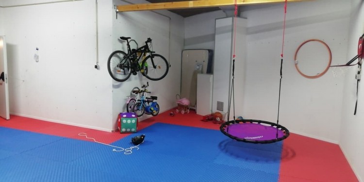 : Attached Garage area with space for 2 cars ( currently transformed into a children's play area )
