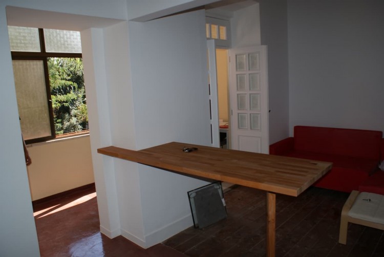 The open plan living room and kitchen feature a high-top breakfast bar. Perfect for social events. The large closed balcony area offers floods of natural light and green/city views including views of the Lisbon bridge