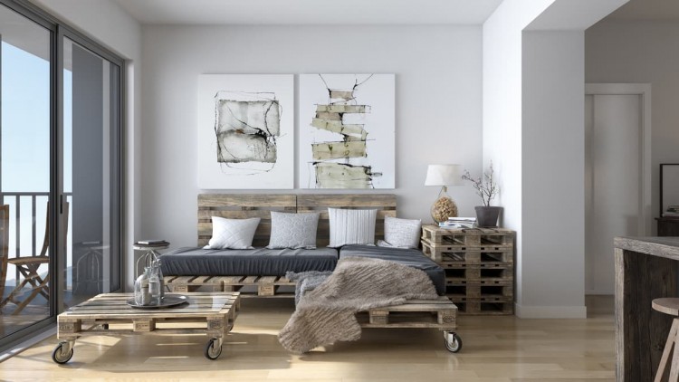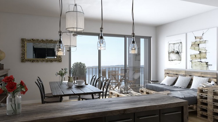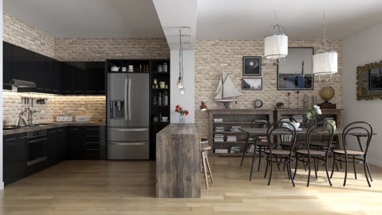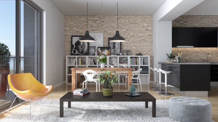 The interiors have unique modern-living and industrial-style features, such as stone walls and open clean spaces.