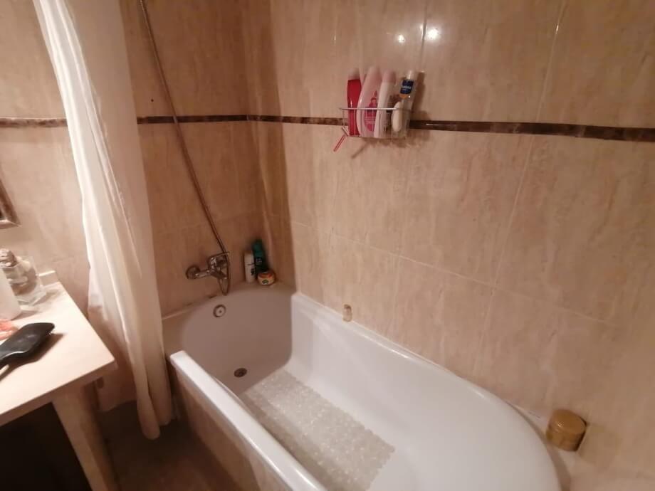 : A large bathroom with marble finishing (including a full sized bath-tub)