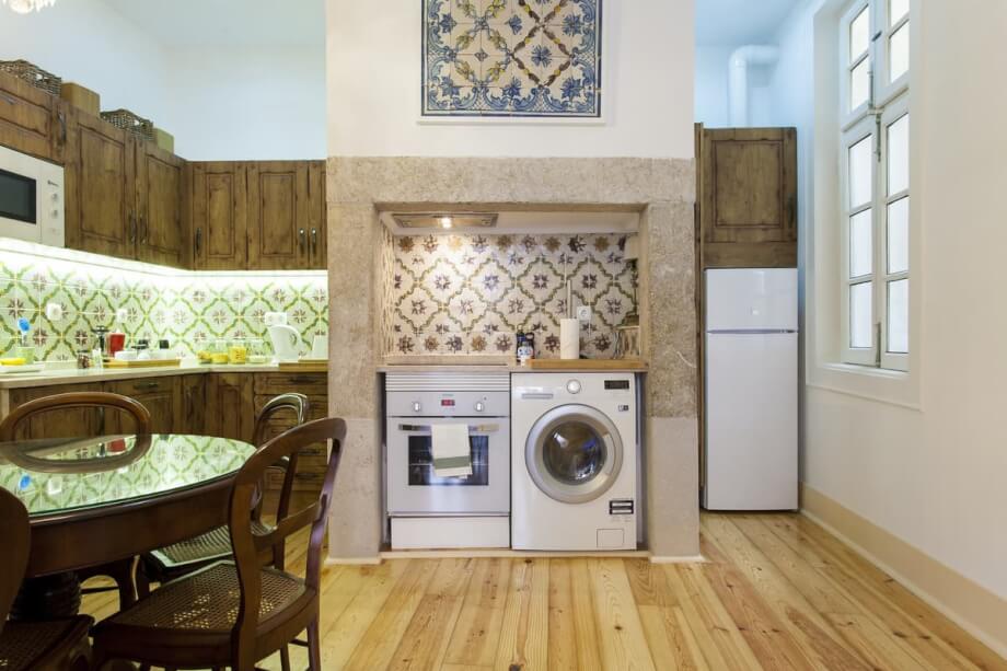 : Fitted kitchen and dining area with traditional stone framing and a distinctive application of Azulejo tiling