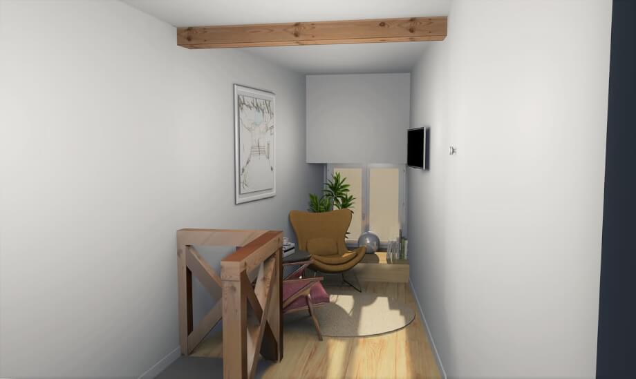 Upstairs is a spacious bedroom with built in storage units and a small living area.