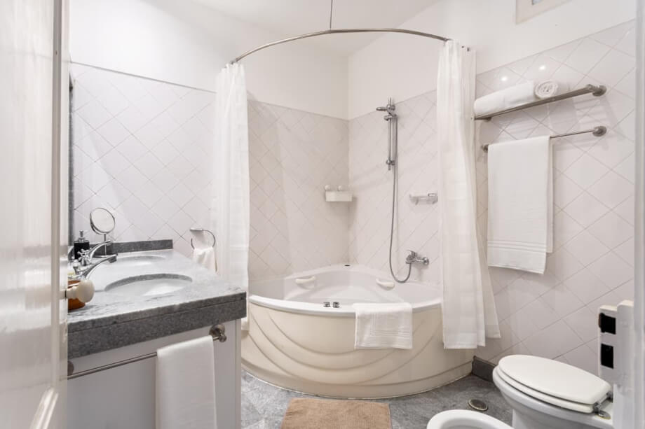 : A large bathroom complete with double sinks a full sized bath and bidet.