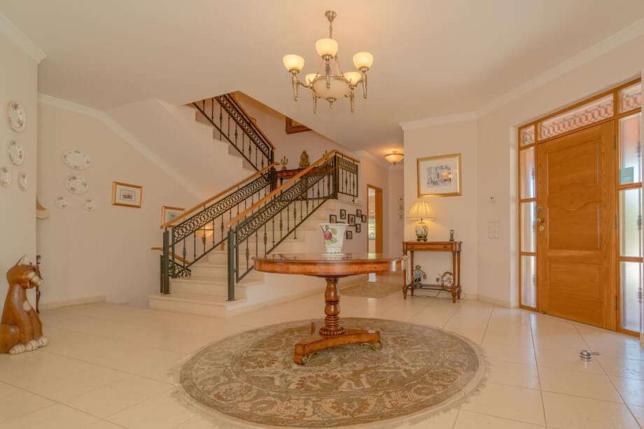 Once inside the main door, the splendour is immediately apparent. The entrance hall reveals the light decor, accentuated by the natural light so abundant in a hill top location such as this. On the right side resides the highly impressive kitchen - a paradise for aspiring cooks and food lovers alike. Double hobs, one gas and one electric reveal an insight into the owner's standards for all things culinary.