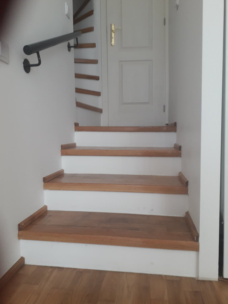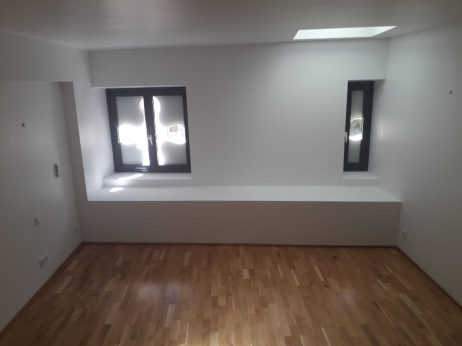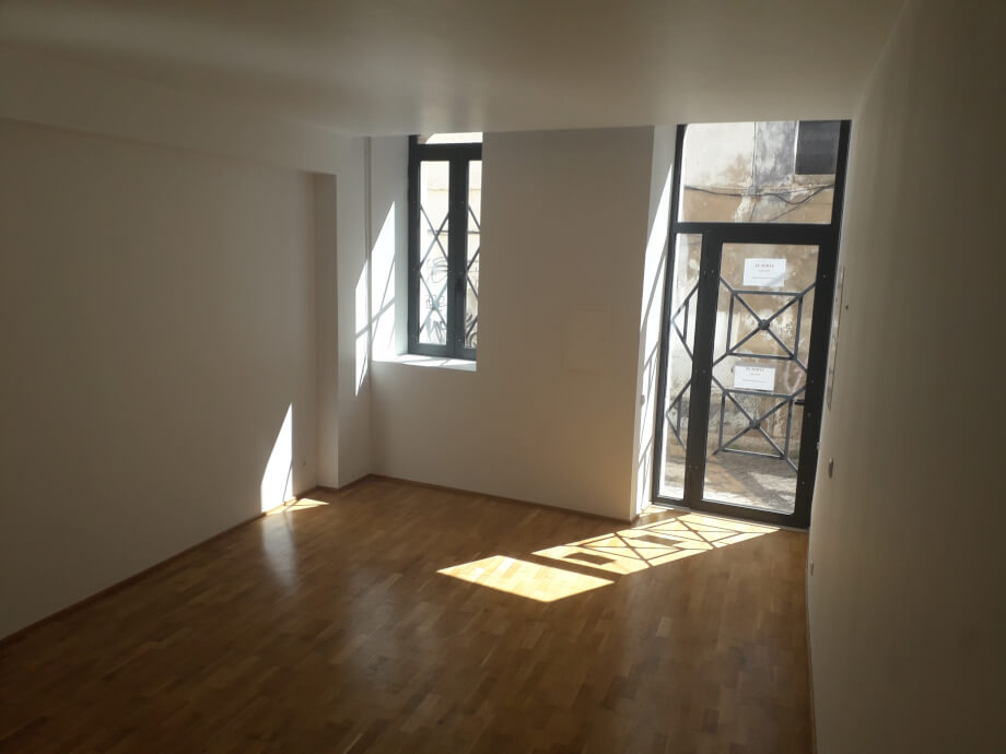 Once inside the iron and glass door awaits the first room, specifically the living area. An area of generous proportions, the front door and the impressive large double window dominate the front while the far end is home to the kitchen section and staircase.