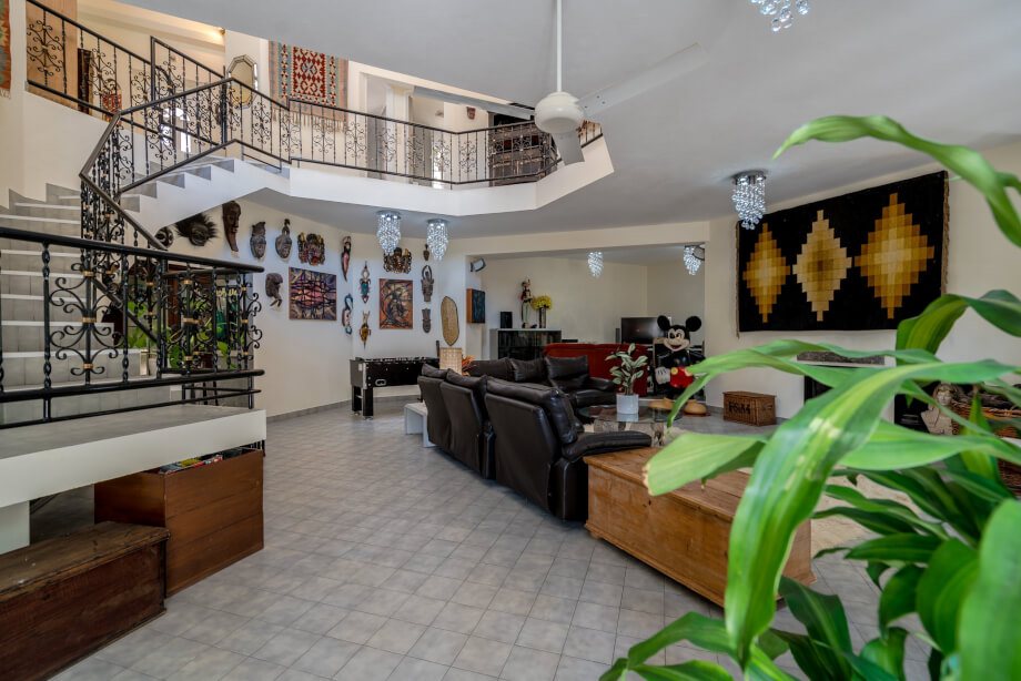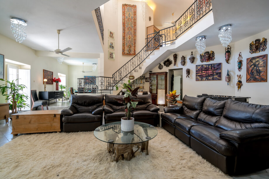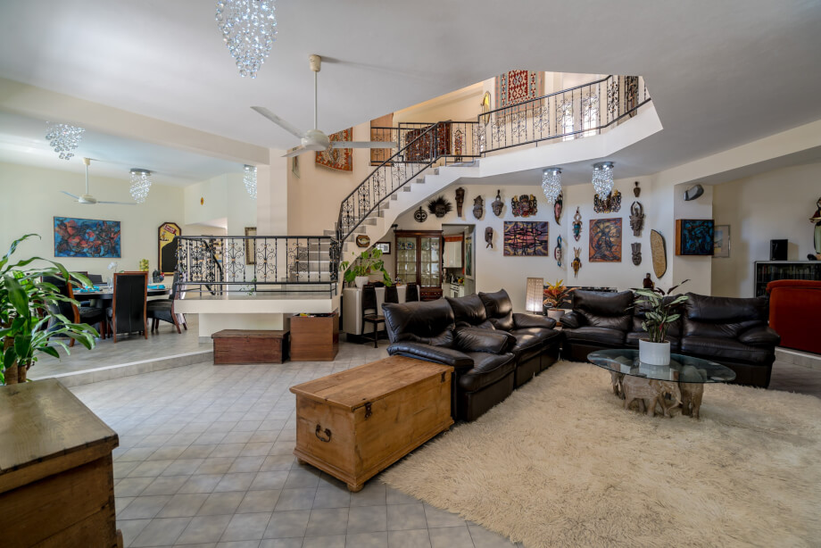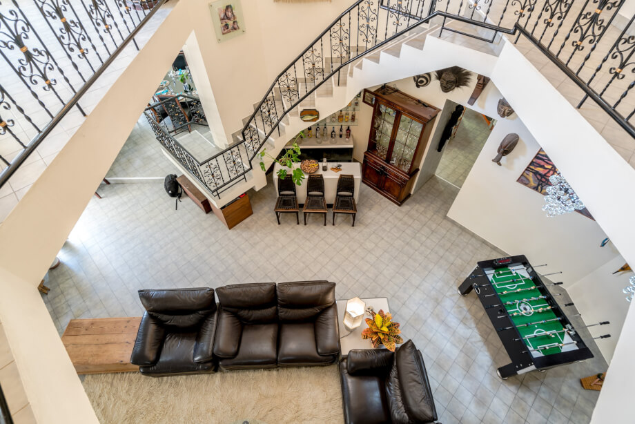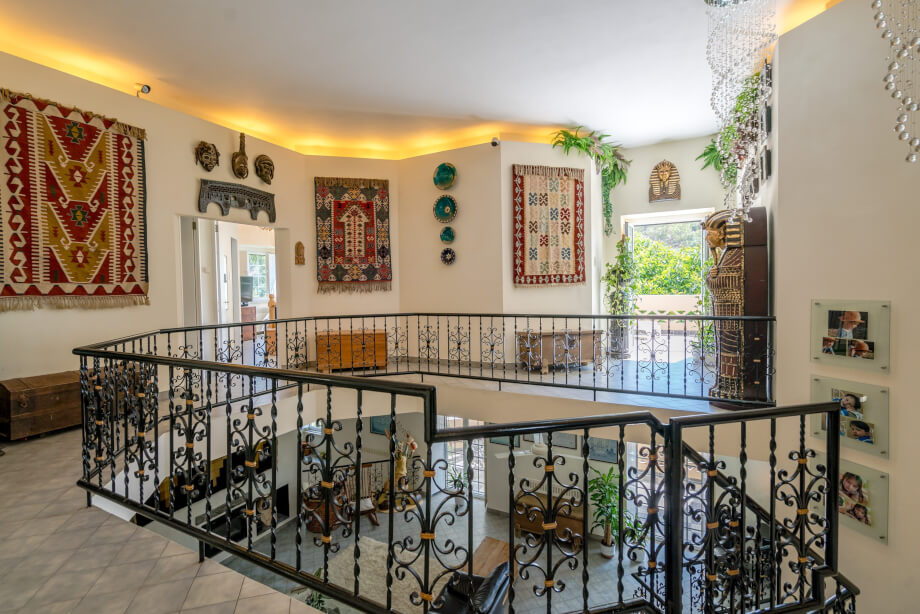On the immediate right side upon entrance lies a reception area, currently utilised as an office, but what immediately grabs the attention is the sheer openness of the interior. The landing skirts the upper level in traditional gallery style, hugging the wall and leaving the majority of the downstairs reception rooms to maximise the cooling circulation that an open and truly high ceilinged area can provide.