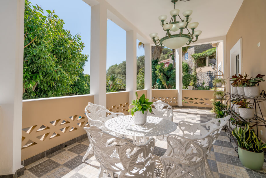 Double patio doors present the downstairs terrace - the pillars giving a somewhat colonial feel. A wonderful antique chandelier adds the gloss to a remarkable platform - simply ideal for those late evening Summer meals.