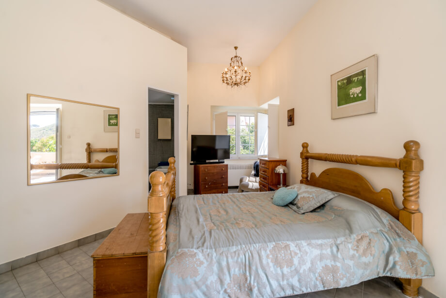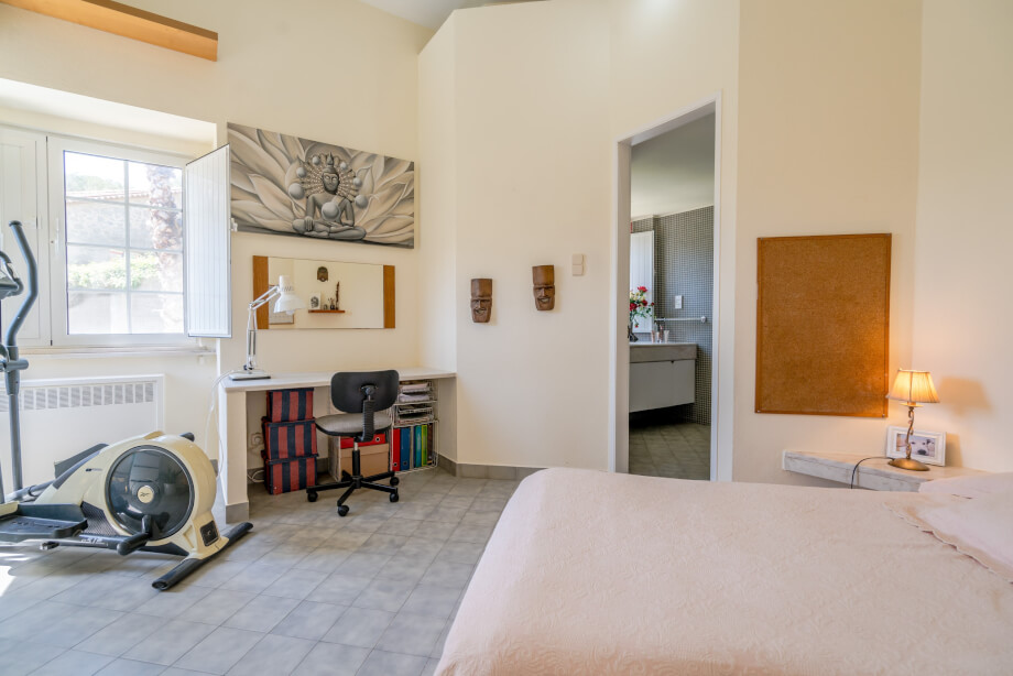 Following the path of the gallery brings first the laundry room and guest bathroom. The huge upper terrace is flanked on either side by the main bedrooms. All 3 are en suite and one with bathtub, with 2 facing onto the outdoor and pool area. Noticeable to the bedrooms is the creative use of angles - certainly no box rooms in this property.
