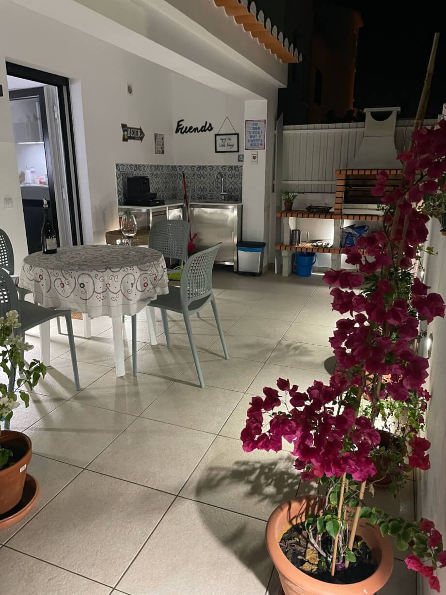 The rear door leads directly out to the exterior area comprising a covered area with kitchenette of stainless steel weatherproof material and LED lighting. The immaculately tiled sun terrace features a security camera and outdoor shower. The BBQ is brickwork and stainless steel grill.