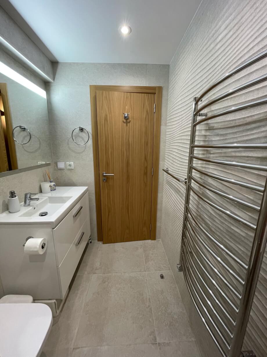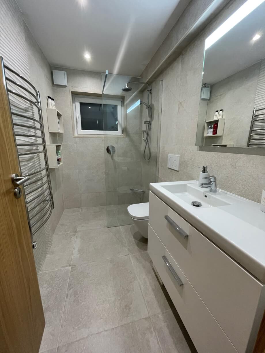 The bathroom, like everywhere else, is stylish and contemporary. There is an underfloor heating system and heated towel rack, bluetooth ceiling speaker exhaust fan with timer.