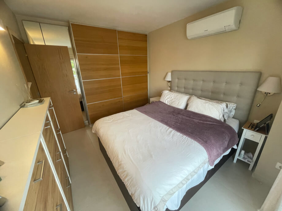 The stairs have movement activated lighting and provide a classy introduction to the upstairs. The bedroom at the rear has floor to ceiling fitted wardrobes and is tastefully decorated. The Master bedroom boasts an elegantly tiled balcony with glass railings. As is standard throughout the modern house the room is lit with LED lights and has USB connections. The large patio doors guarantee an abundance of light. Also of note are reversible Air Conditioning and built in wardrobes with mirrored doors.