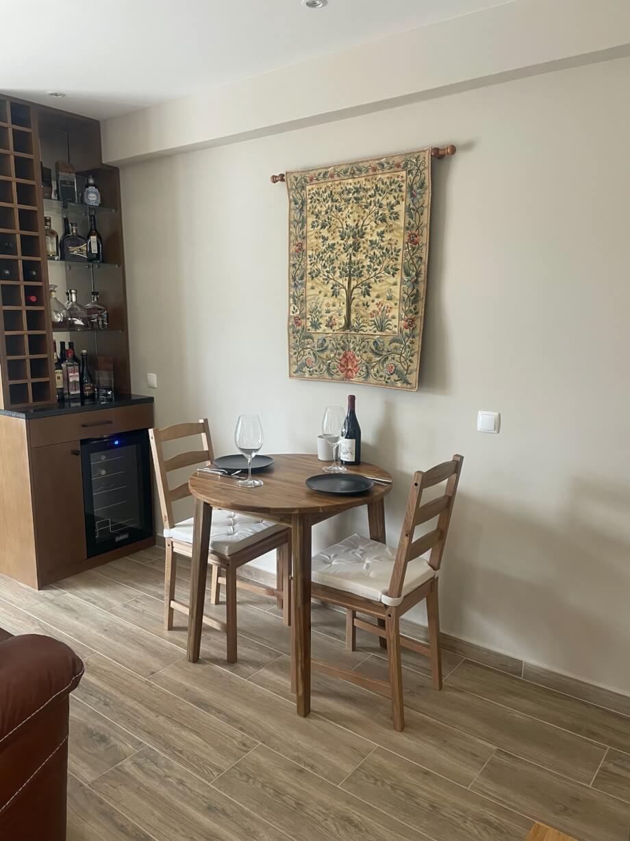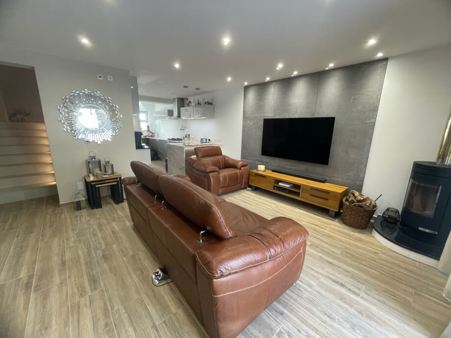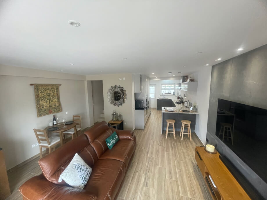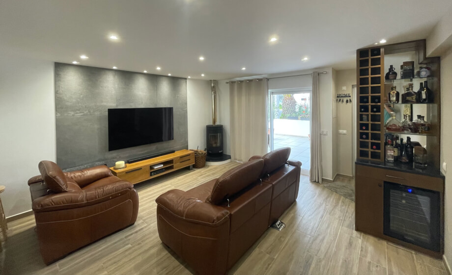 The secure front door (reassuring, even though Portugal is one of the World's safest countries) opens into the hugely impressive and welcoming ground floor area. Features of note include the mightily impressive woodburner in the corner, double sliding patio doors providing access to the outside front yard, a mini bar and wine fridge and the highly stylised wall decor. The sunken LED controllable light system coupled with the warm glow of the woodburner gives opportunity to create an ambience of choice.