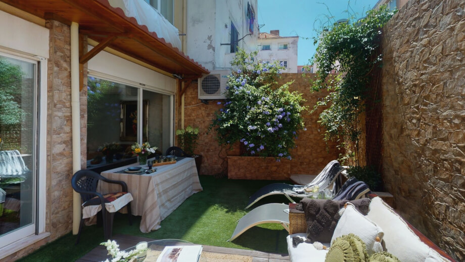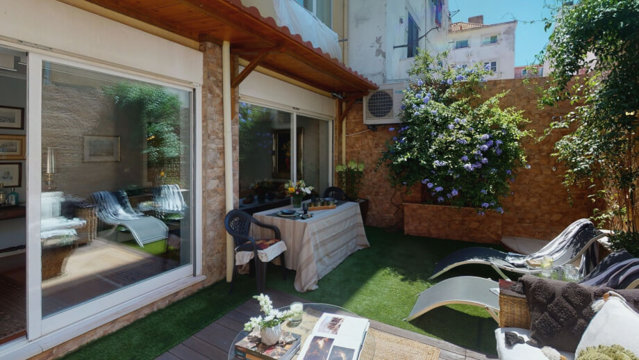 Located in a historic building, in one of the noblest areas of Lisbon. The apartment was completely renovated in 2009 with premium finishes and details, and has a large living room with direct access to the patio. Fully equipped kitchen with direct connection to a spacious dining room. Two bedrooms, one of which is a suite with WC and a small storage room. 2 complete bathrooms and a large entrance hall with storage space (12.2m2). The patio with 25m2 and facing west, has an outdoor shower, shed and synthetic grass flooring and deck.