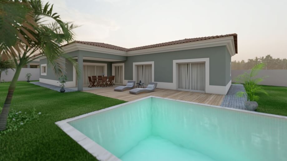 High end single storey Villa's under construction. Large outdoor area with pool and terraces within growing community.