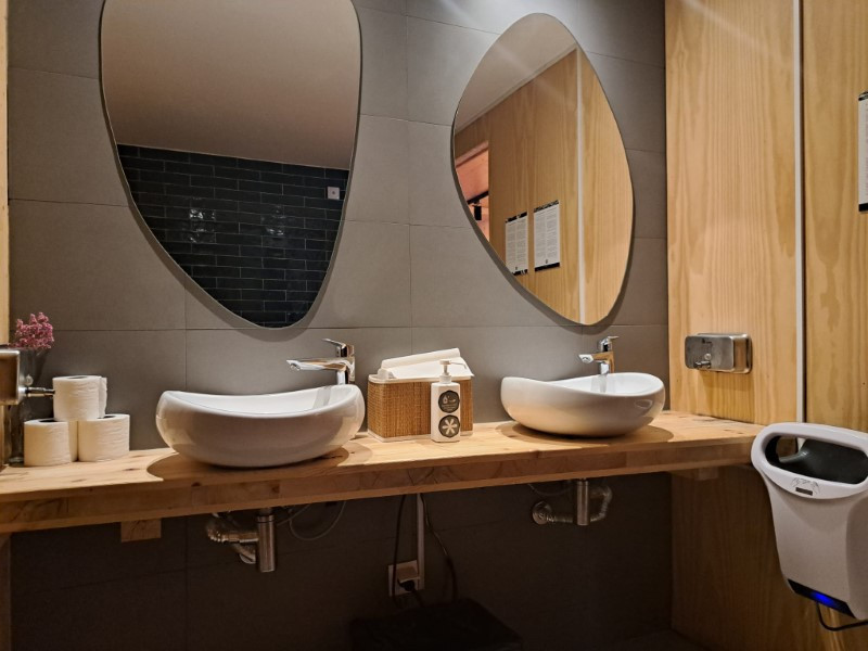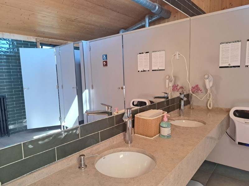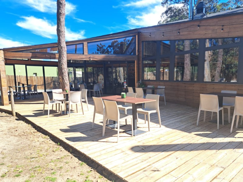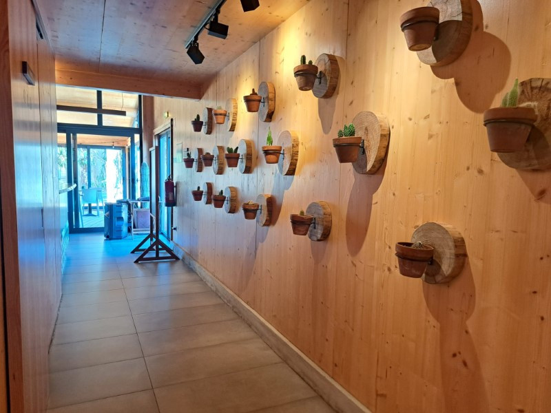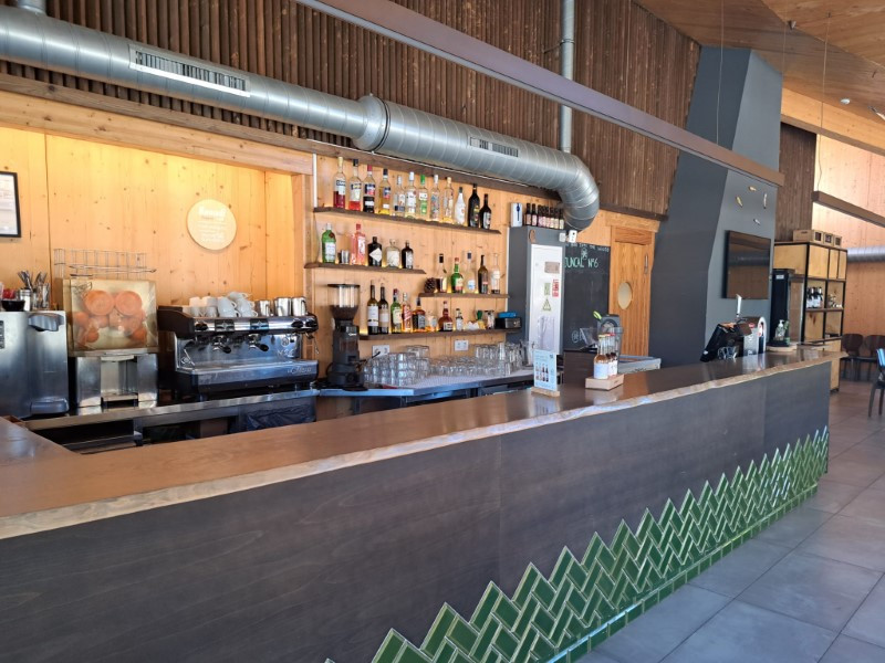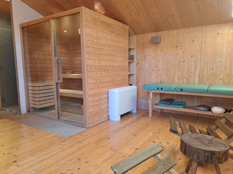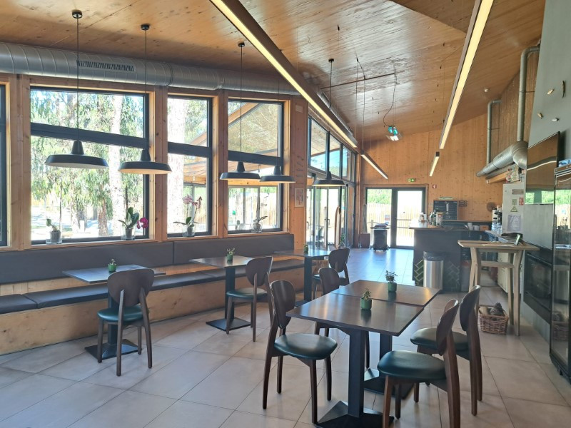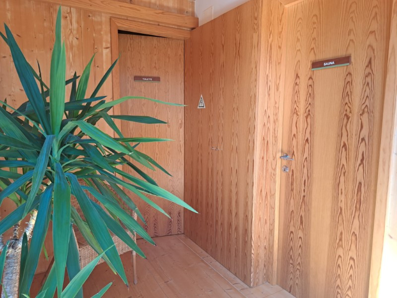 1 main building with reception/shop, multipurpose space, toilet and restaurant/bar with terrace on the ground floor. Sauna and massage rooms, bathroom and terrace on the 1st floor.