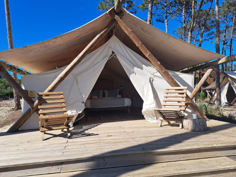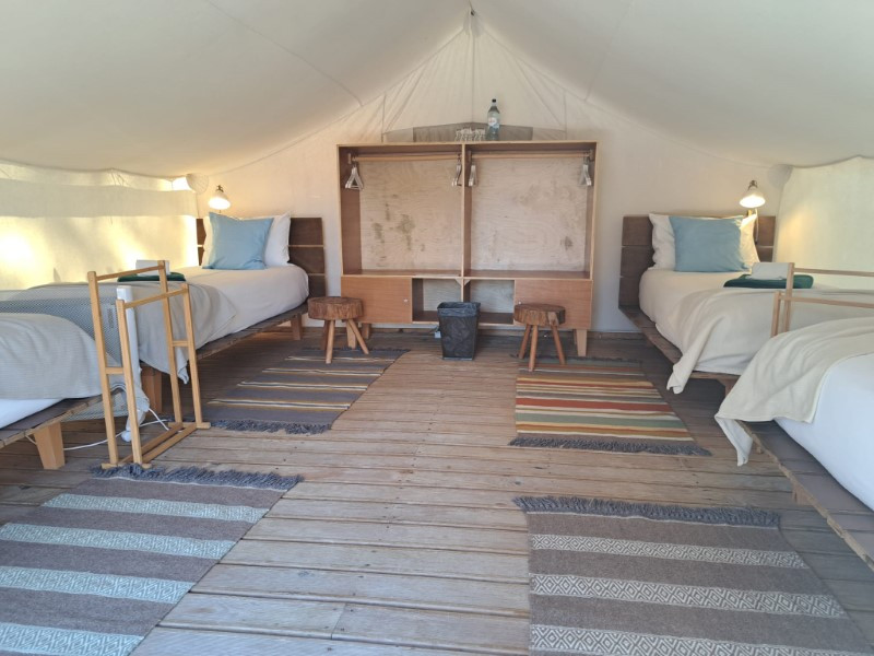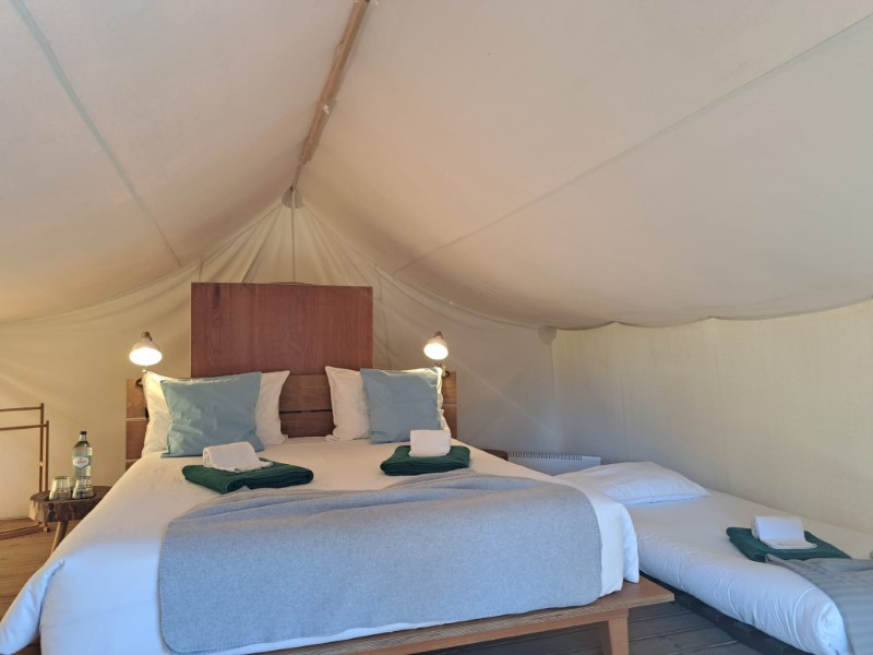 Inside the tents made of waterproofed cotton fabric, protected by an extra covering of the same material, erected on a wooden 'deck', reigns the simplicity of a Glamping experience with the comfort of a bed, handcrafted furniture and heaters and access to the beach resorts.