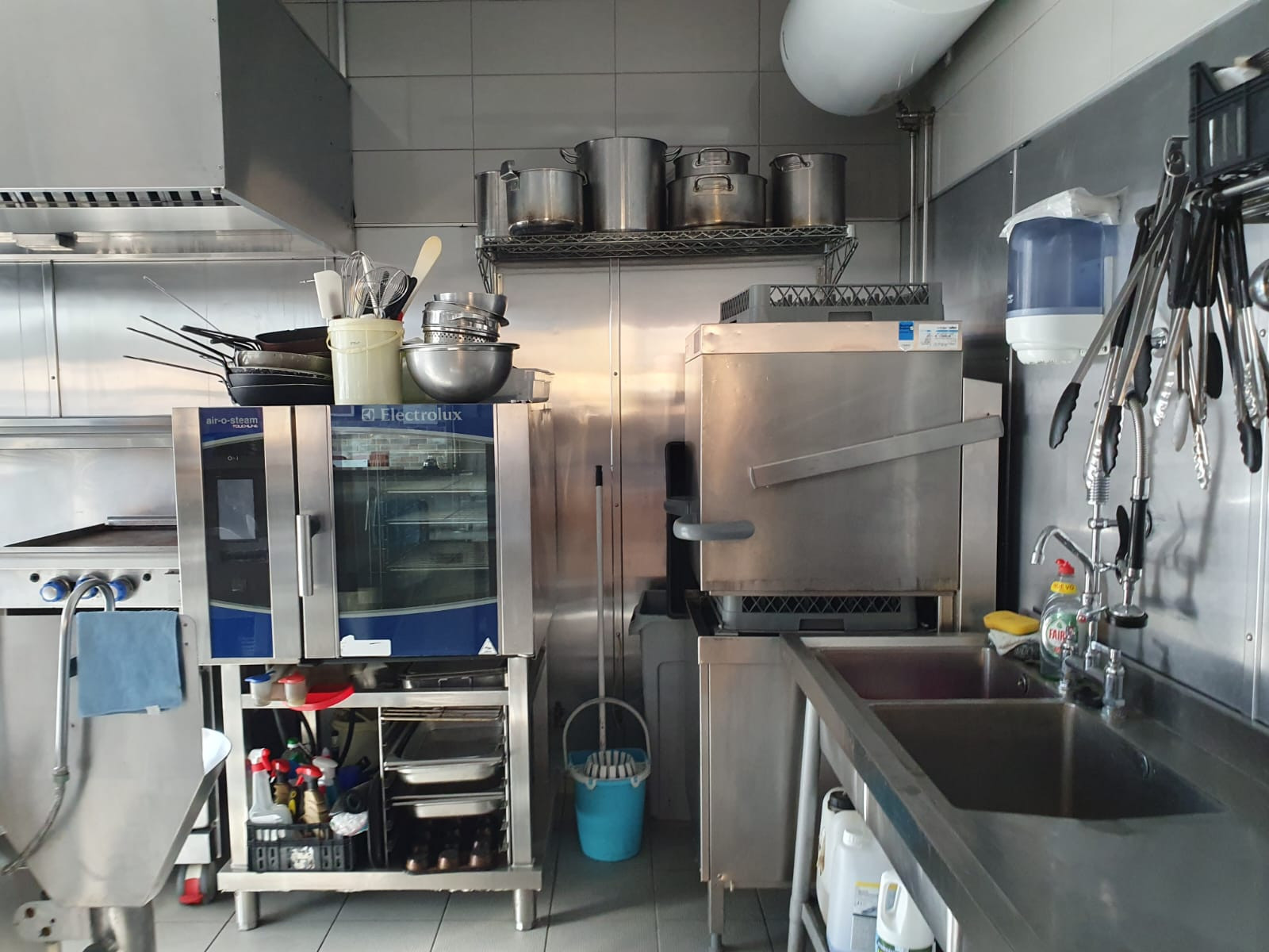 The spotless stainless steel kitchen is fully equipped and is ready for orders!
