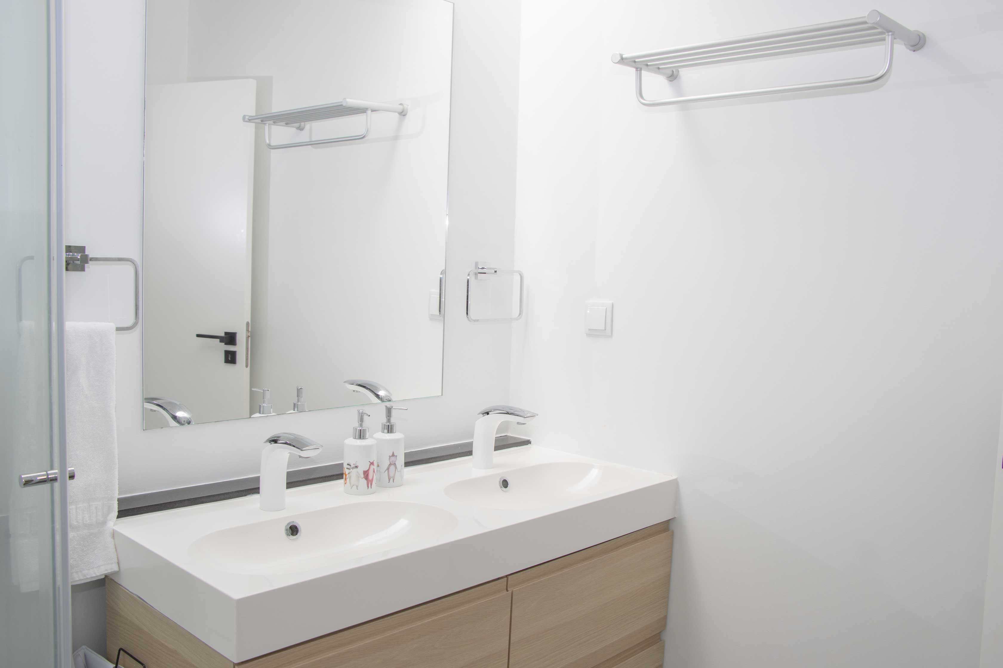 2nd washroom features a glass shower and double vanity, bright and spacious with a skylight