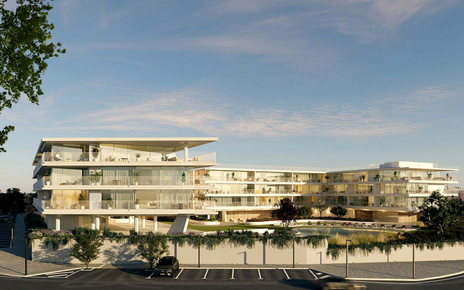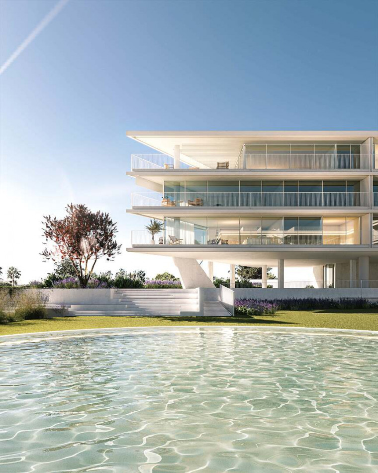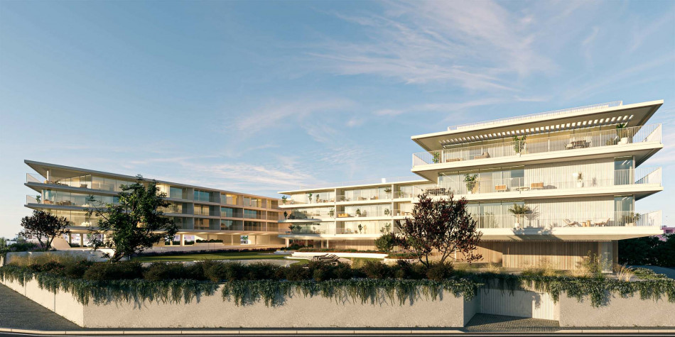 Two buildings that rise from the ground and take advantage of the visual permeability, the balconies are an extension of the interior that develops over the green spaces, a simple and minimalist language, rhythmed by the glazed spaces that mark the facade .