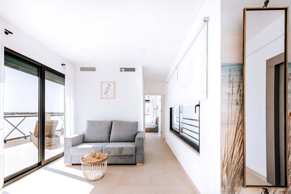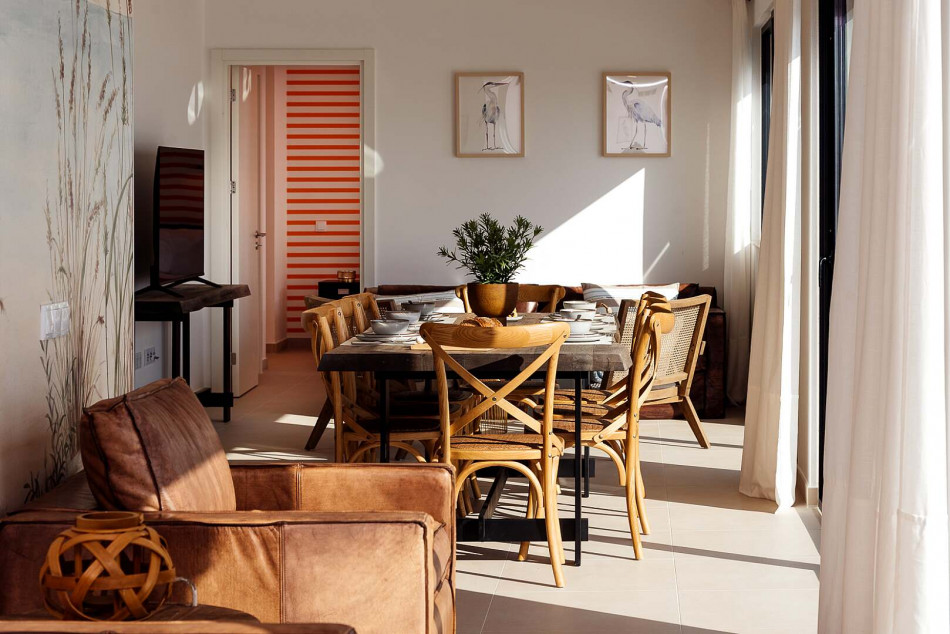 Interior Design: The penthouse interiors embody elegance through a modern coastal aesthetic, featuring natural sandy hues, sleek lines, and high-quality materials. In the living room, floor-to-ceiling panoramic windows invite ample natural light. Offering sweeping views and a seamless indoor-outdoor feel. Premium finishes such as porcelain tiles, wood, and marble-clad walls add an air of refinement. While the open floor plan enhances spaciousness and comfort.