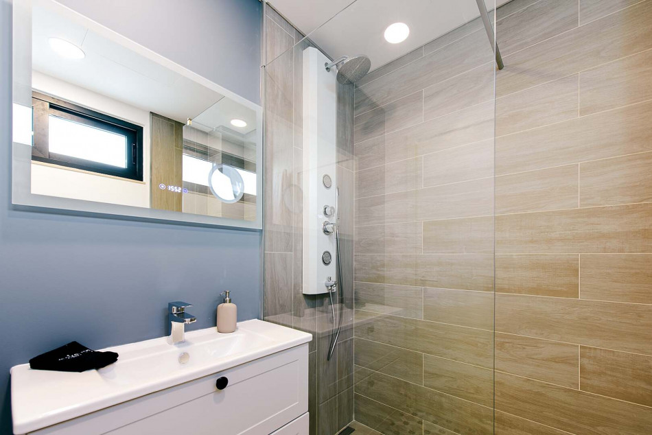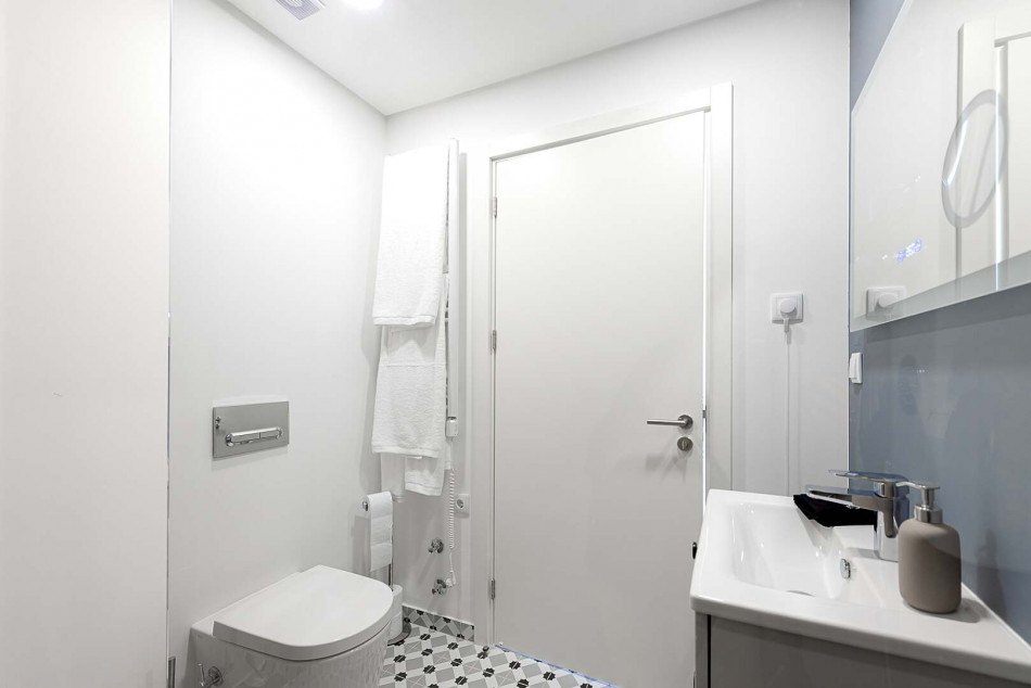 Bedrooms and Bathrooms: The bedrooms feature panoramic windows, inviting natural light and views, while polished porcelain tiles and wood veneer closets bring warmth and richness. Marble accents in the master suite add a touch of luxury. The bathroom offers a spa-like retreat, complete with Vitra fixtures, a walk-in shower, and ambient lighting. Wood-like tiles, black and white accents, heated towel racks, and elegant vanities make it a sanctuary of relaxation.