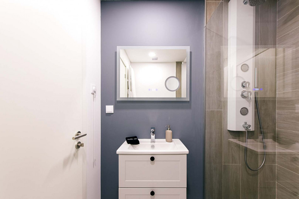 Kitchen: The kitchen reflects luxury and functionality, with high-gloss cabinetry, wood accents, and granite countertops. Outfitted with high-end German appliances, an induction hob, and stylish porcelain tiles, it’s designed to make cooking both practical and enjoyable. The space is further enhanced by a wood-slatted room divider, creating a balanced aesthetic between form and function.