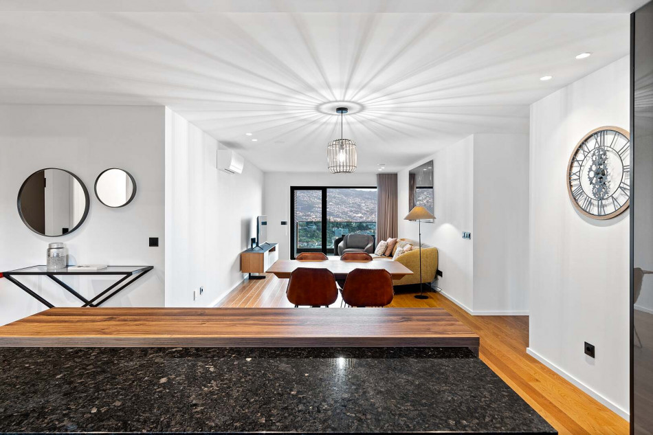 Nestled in a tranquil yet accessible area, this apartment provides residents with a peaceful retreat while still being close to the heart of Funchal. Its elevated position ensures unobstructed views of the sparkling Atlantic Ocean, lush mountain ranges, and the vibrant cityscape below.