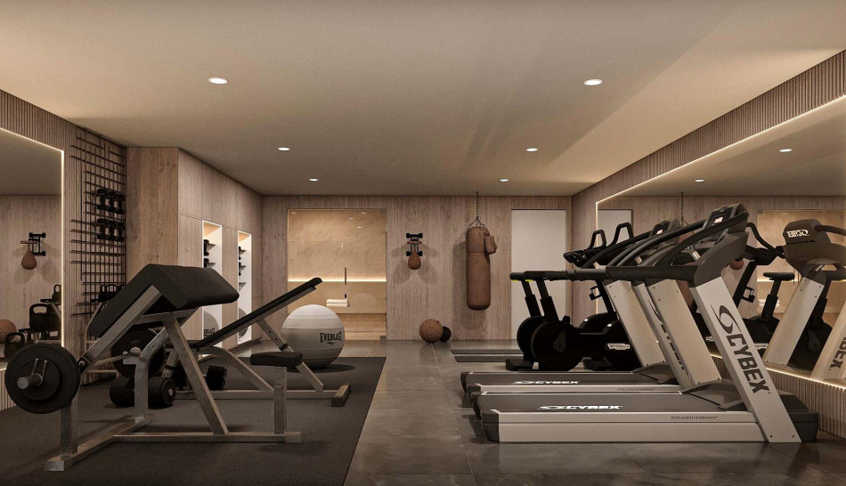 A basement featuring a garage for 2 cars, gym, sauna, and a one-bedroom apartment with an en-suite bathroom.
