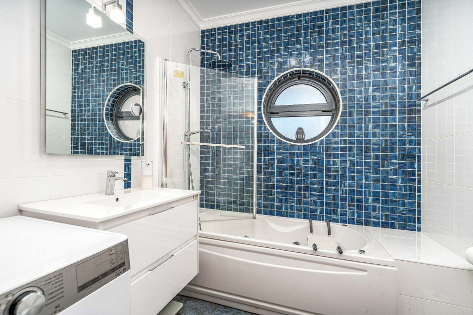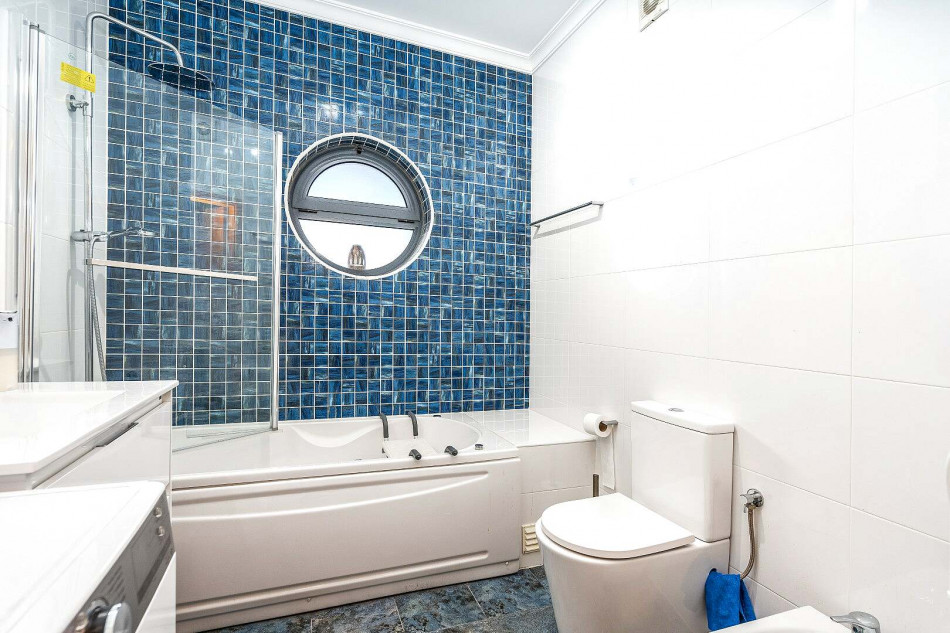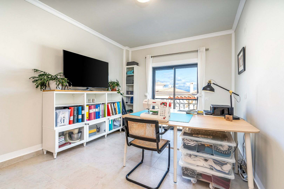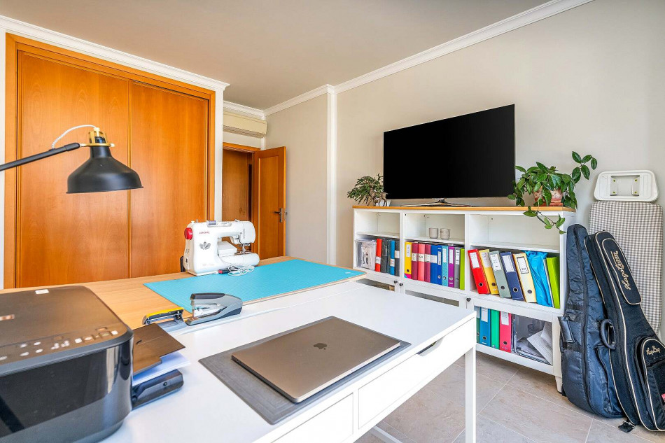 The hallway leads to three generously sized bedrooms, each designed for maximum comfort. All bedrooms are fitted with built-in wardrobes and air conditioning units. The master suite offers a private balcony with scenic mountain views, as well as an en-suite bathroom featuring a luxurious jacuzzi bath. The second bathroom, shared by the other two bedrooms, has been tastefully updated with modern fixtures. One of the bedrooms is currently utilised as a bright and airy office space, making it ideal for remote work or creative pursuits. Additional storage is available in the form of a convenient linen cupboard in the hallway.