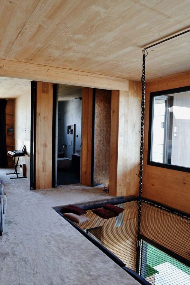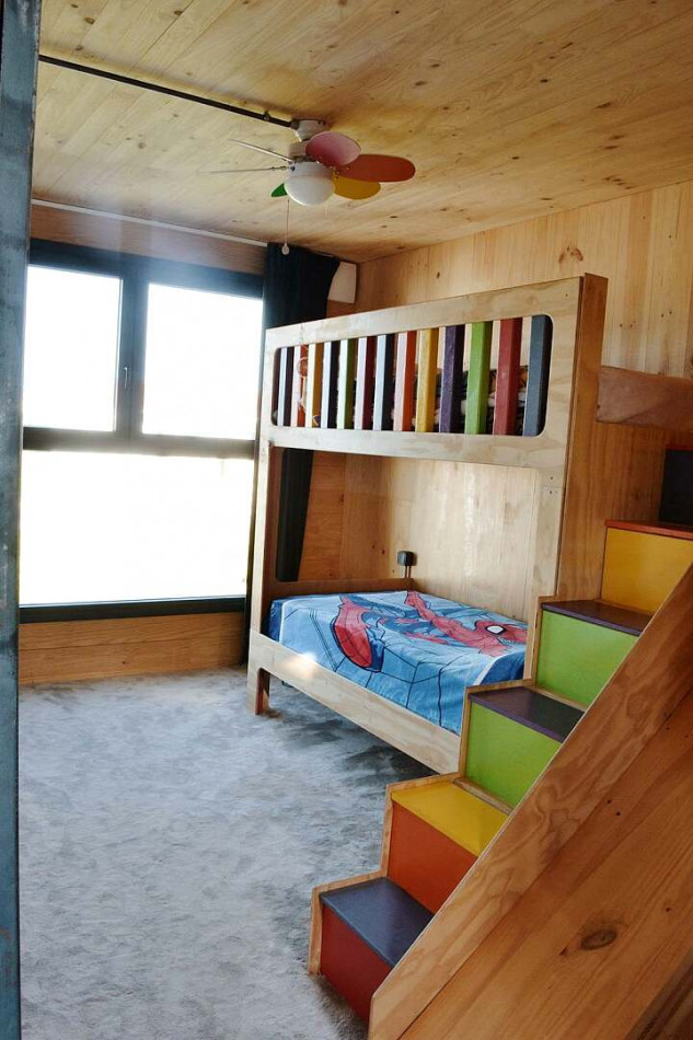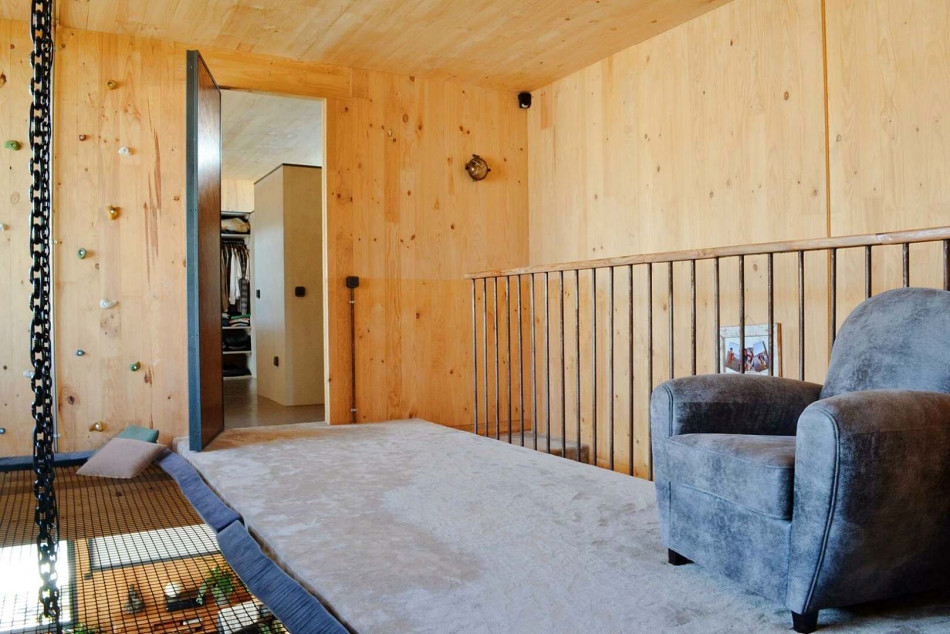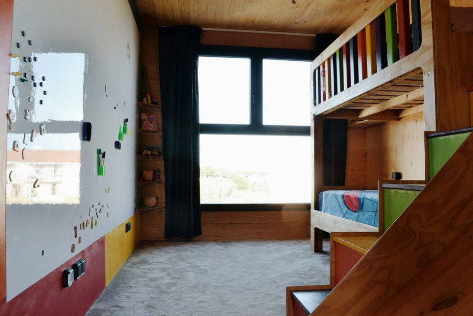 A playful children’s room featuring a bespoke bunk bed with slide, loft net and integrated whiteboard