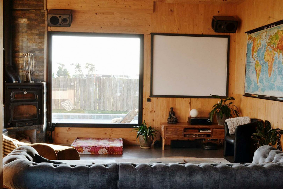 The SMEG-equipped kitchen, fireplace with built-in oven and projector with surround sound anchor the space as a genuine family hub — equally suited to relaxed weekday evenings or long summer gatherings.