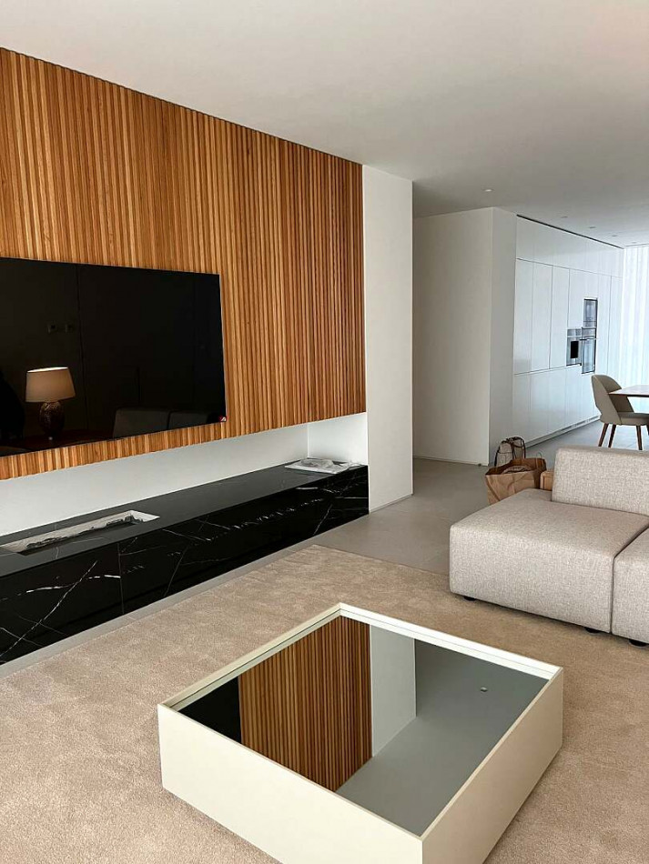 Every element within this residence speaks to extraordinary attention to detail. The open-concept living spaces feature floor-to-ceiling minimalist windows that flood the interior with natural light while framing mesmeriisg views of the surrounding water canals and golf fairways. Premium Italian marble flooring extends throughout, complemented by bespoke cabinetry crafted from the finest Portuguese walnut.