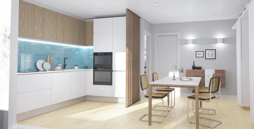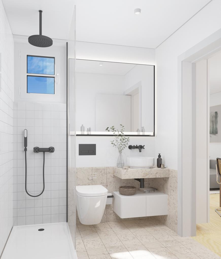 KITCHEN & WC • Fully equipped kitchen with TEKA appliances or similar • Stone kitchen countertop • Placing tiles between kitchen furniture • Built-in faucets • Fiber shower tray • Installation of glass shower screens