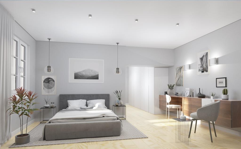 FLOORS, WINDOWS & DOORS • Installation of new floor in Portuguese pine with insulation • New footers • Placement of new screed in the bathroom area and new tiles • PVC double glazing windows • All new custom-made carpentry, kitchen furniture, wardrobes, bathroom furniture and interior doors
