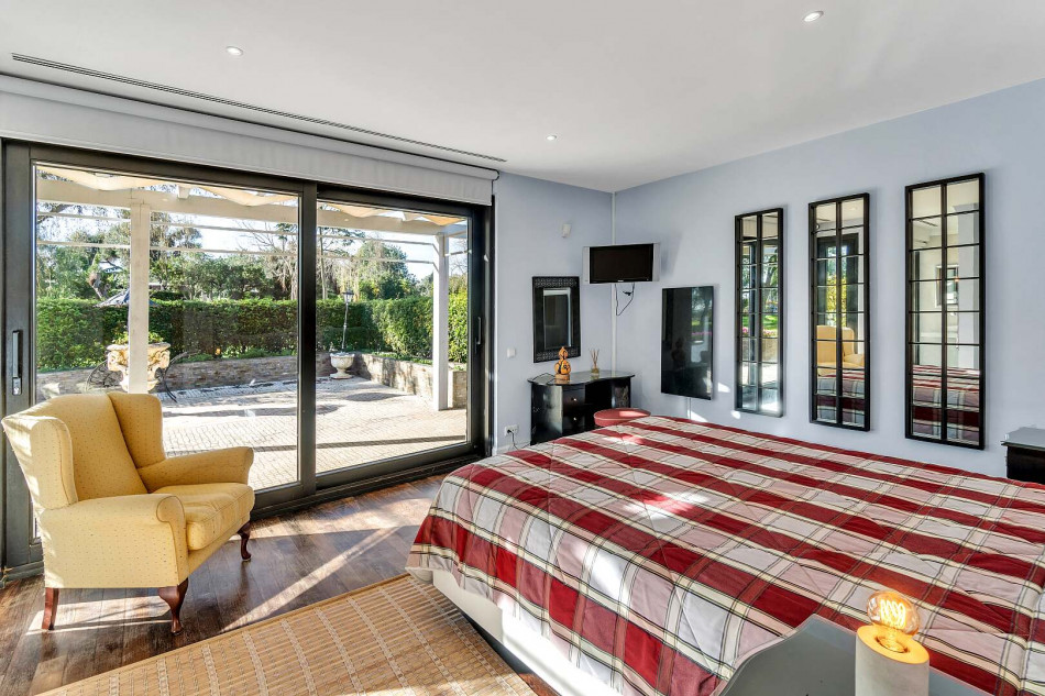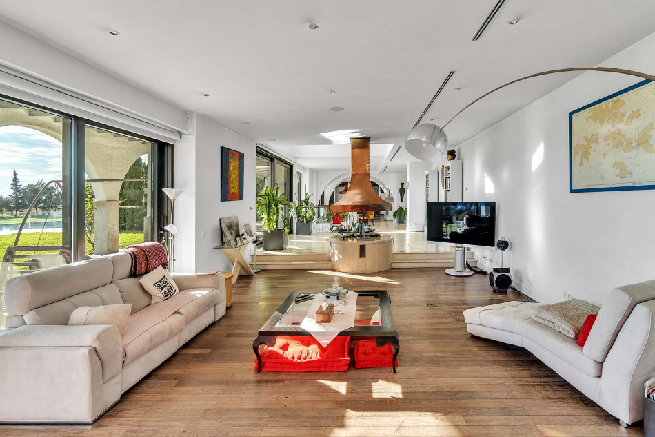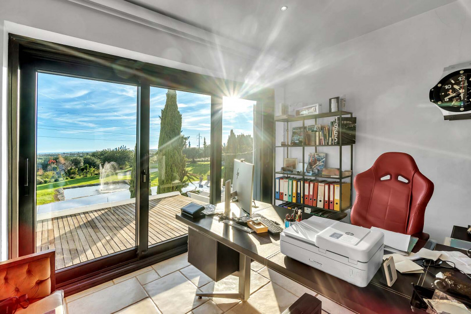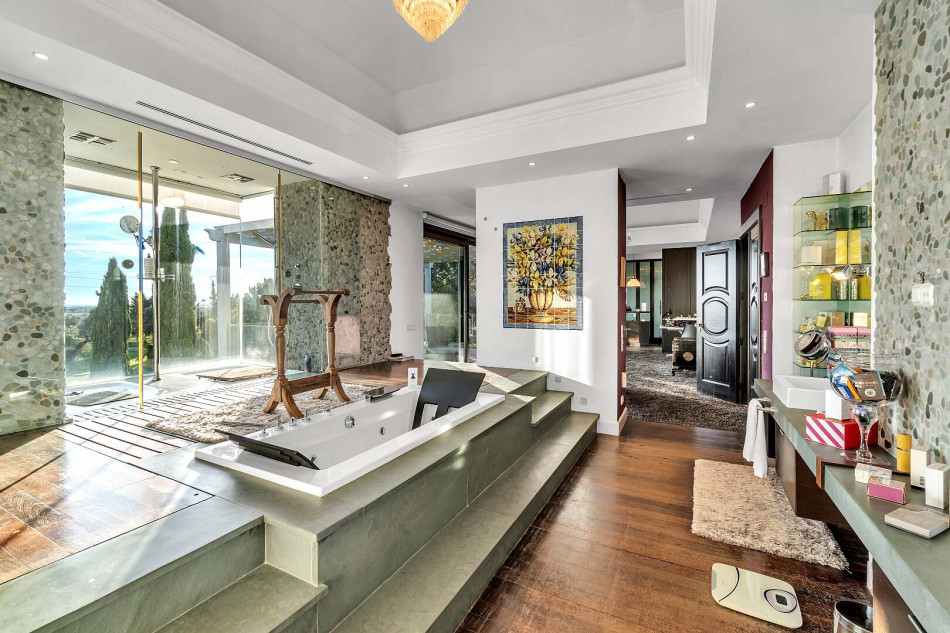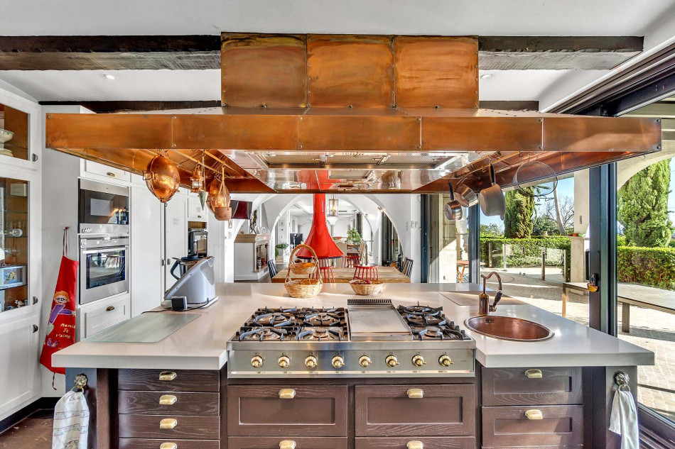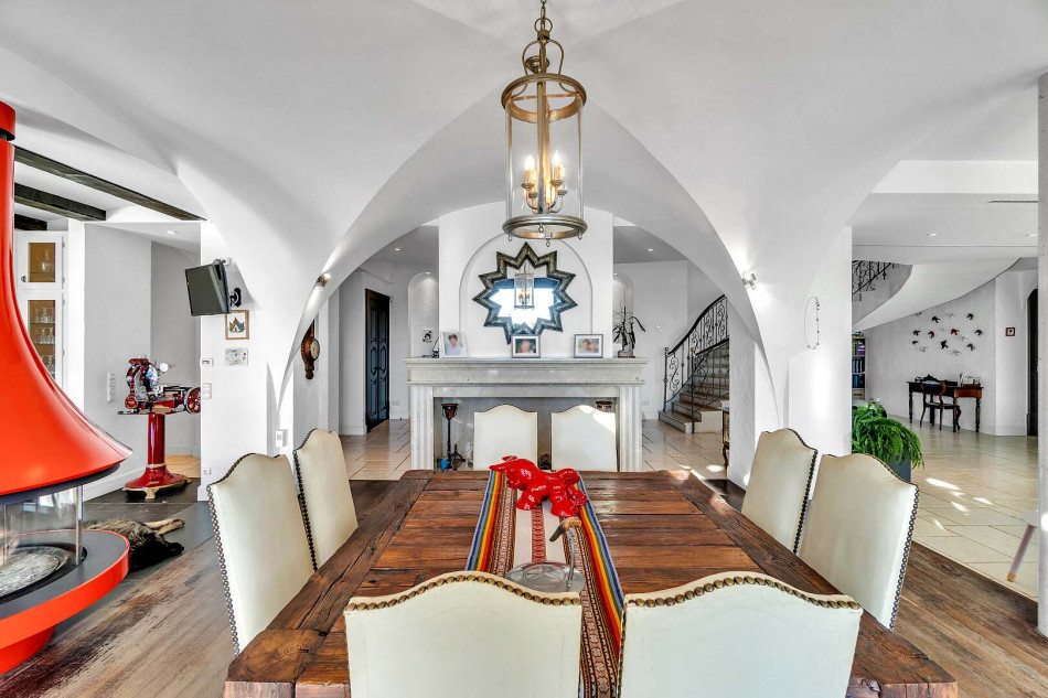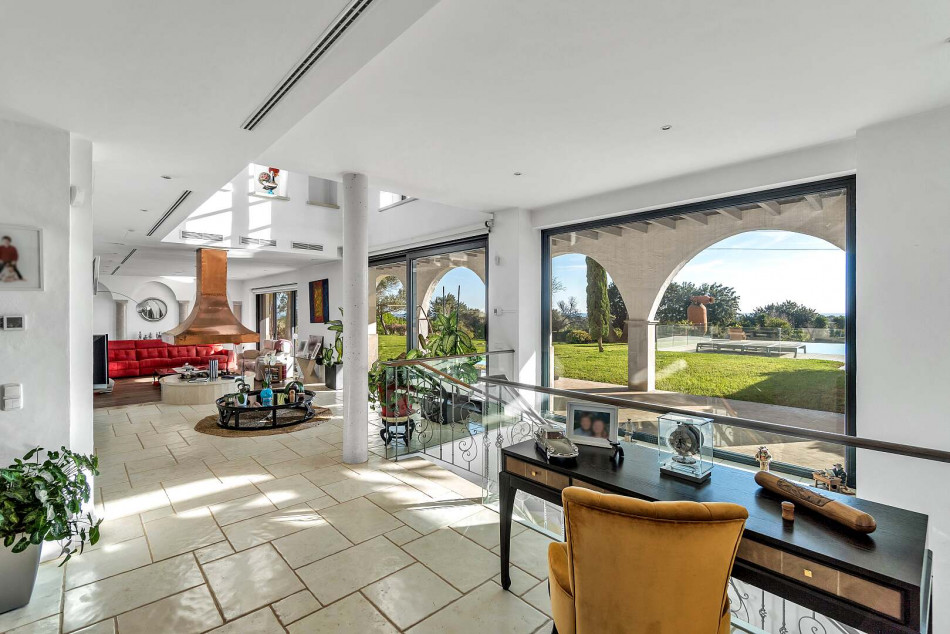 Several fireplaces are displayed throughout this property, adding warmth, design and texture to the villa's various rooms. Large windows in all south-facing rooms provide access to the outside terrace, gardens and pool, adding light to these large spaces.