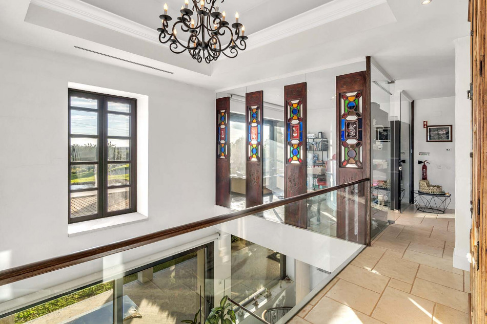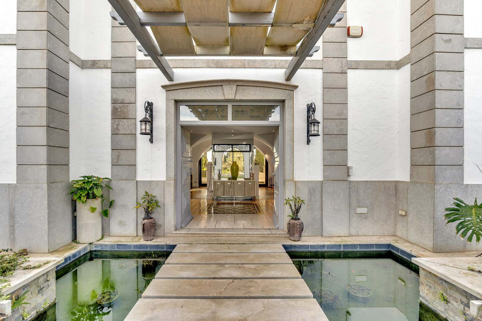 The passage to the main door is over a water effect, and welcomes you to a large reception, opening onto the living room and dining room. A decorative staircase, pillars, arches and high ceilings make a unique combination of shapes that complete this fantastic space.