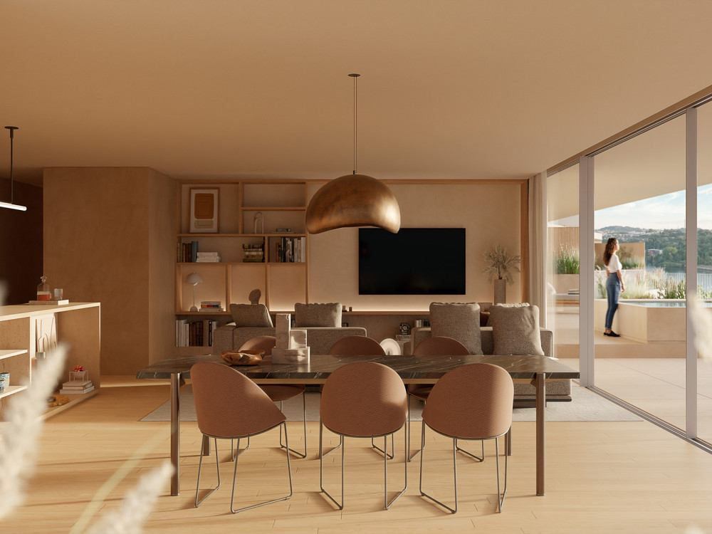 With unique details, such as minimalist windows across the façade over the river, the apartments are invaded with natural light mirrored by the waters of the Douro River.