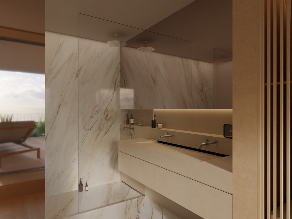 With premium finishes, the flat has solid flooring in the living rooms, bedrooms and service bathroom, Travertine marble in the suites, Roca crockery, Bruma taps and Miele appliances.