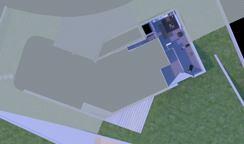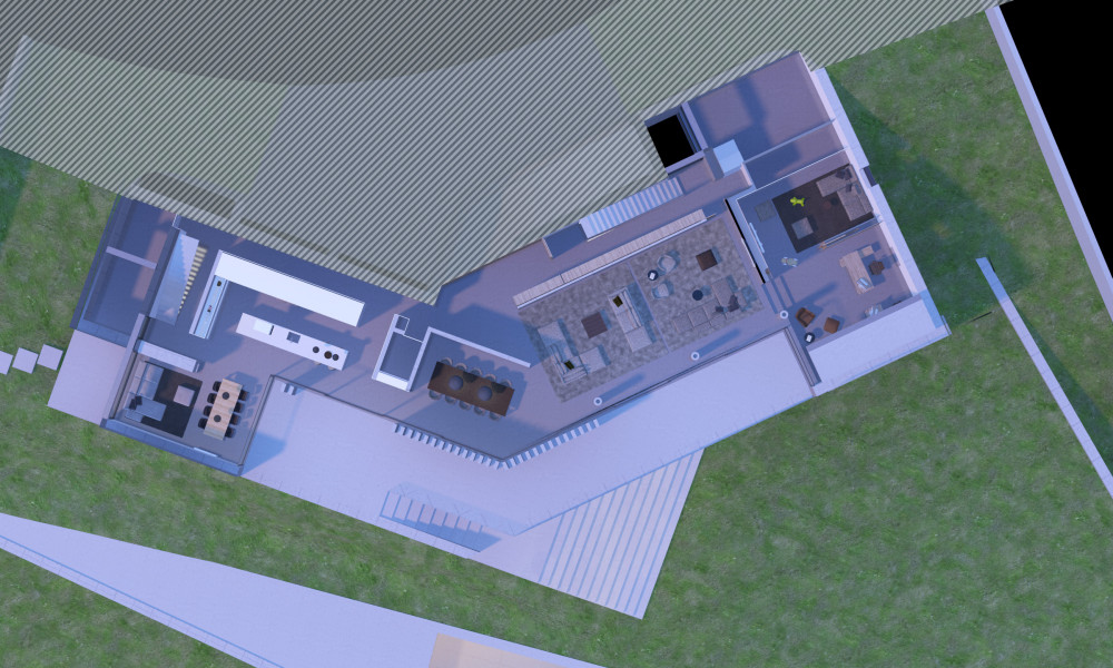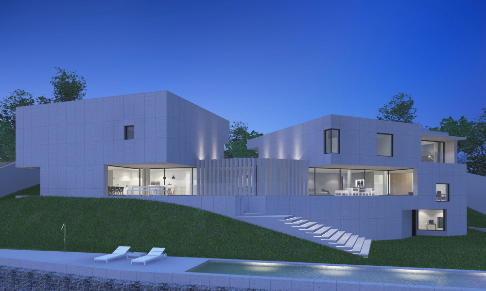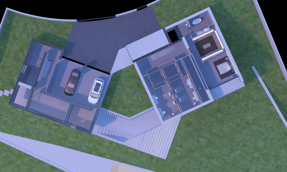 The villa project is located on a plot of land with a total area of 2,421.90 m2. The planned construction occupies an area of 817m2, with a gym, swimming pool, gardens and parking lots. The villa is planned with a floor at the level of the access street, where the garage and the main entrance are located. The family and living area unfolds below this level, entirely facing the garden with total privacy.