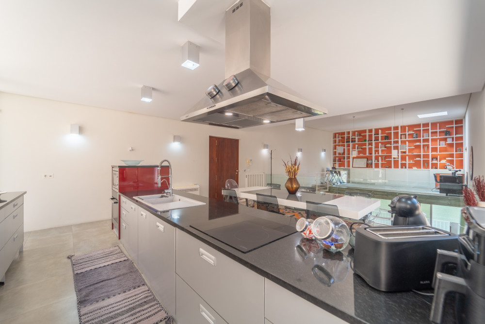 The main 4 bedroom villa is the most impactful central element, where we find, on the upper floor, the full kitchen with dining room and office in open space - in a "U" layout.