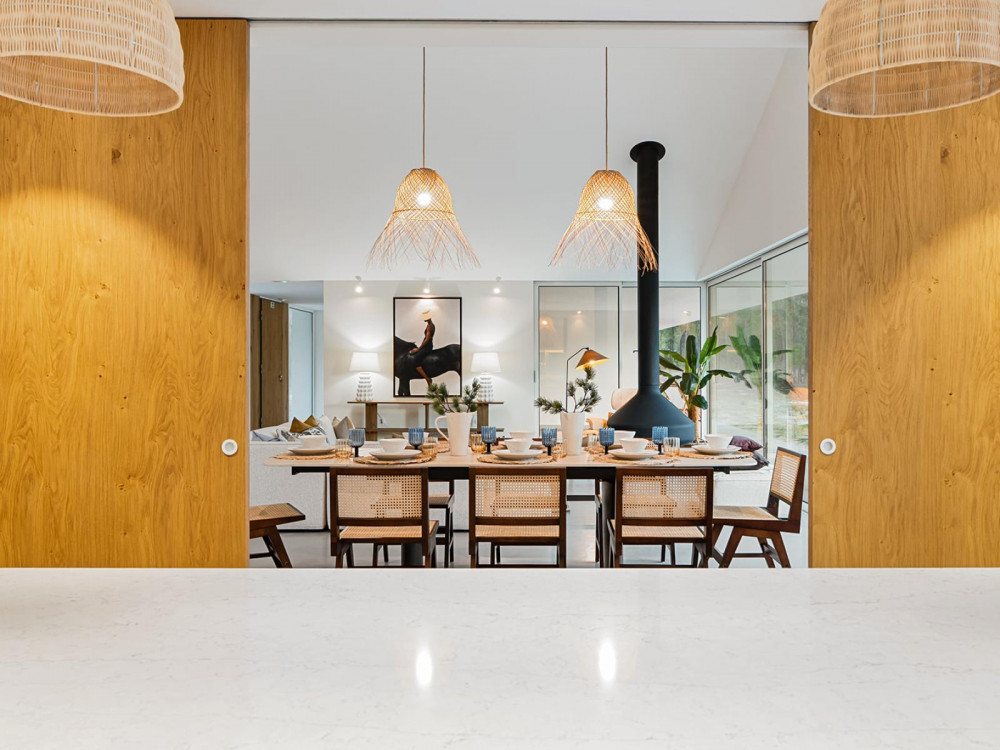 The villa consists of 3 suites, open space kitchen for the dining room, pantry, a large living room with suspended fireplace model Ergofocus and with access to the outside and a guest bathroom. Outside, we find the garden framed with the surrounding countryside of the region, swimming pool and a pergola with dining area.