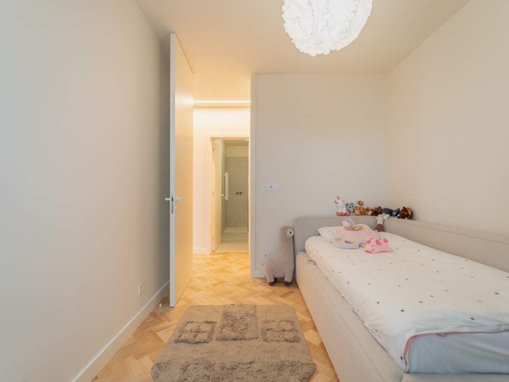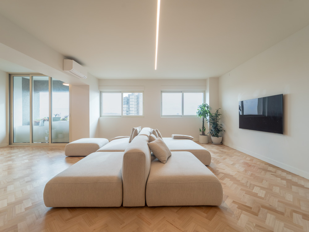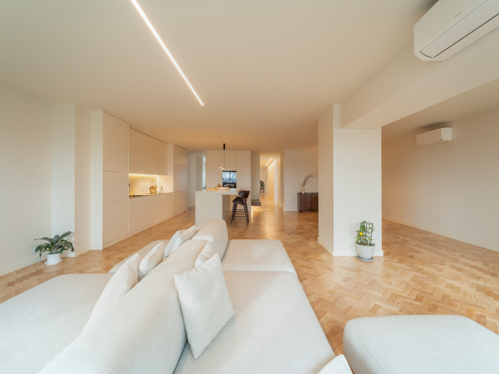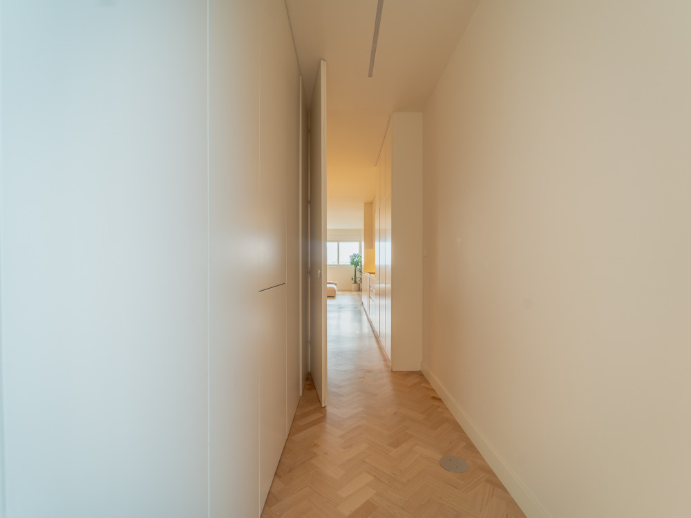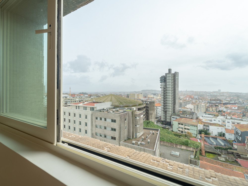 Originally a T5+1, the property was transformed into a large and functional T4, located on the 9th floor of a building with totally unobstructed views over the city of Porto. The social area is developed in a generous open space, where the living room and kitchen are integrated in a fluid way, creating a contemporary, bright and versatile environment. The flat also has four bedrooms, one of which is a very generously sized suite, ample storage capacity, independent laundry and a parking space.