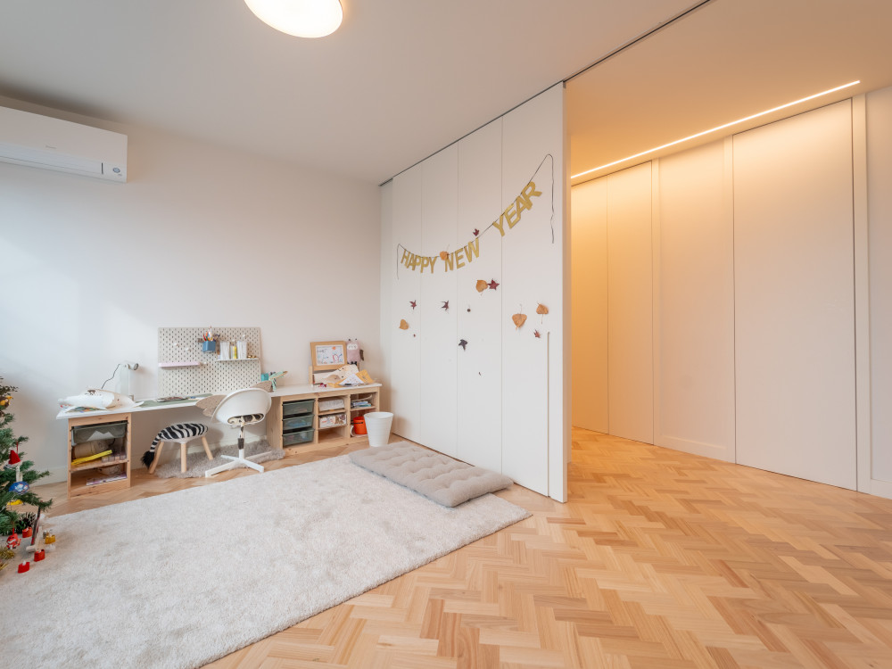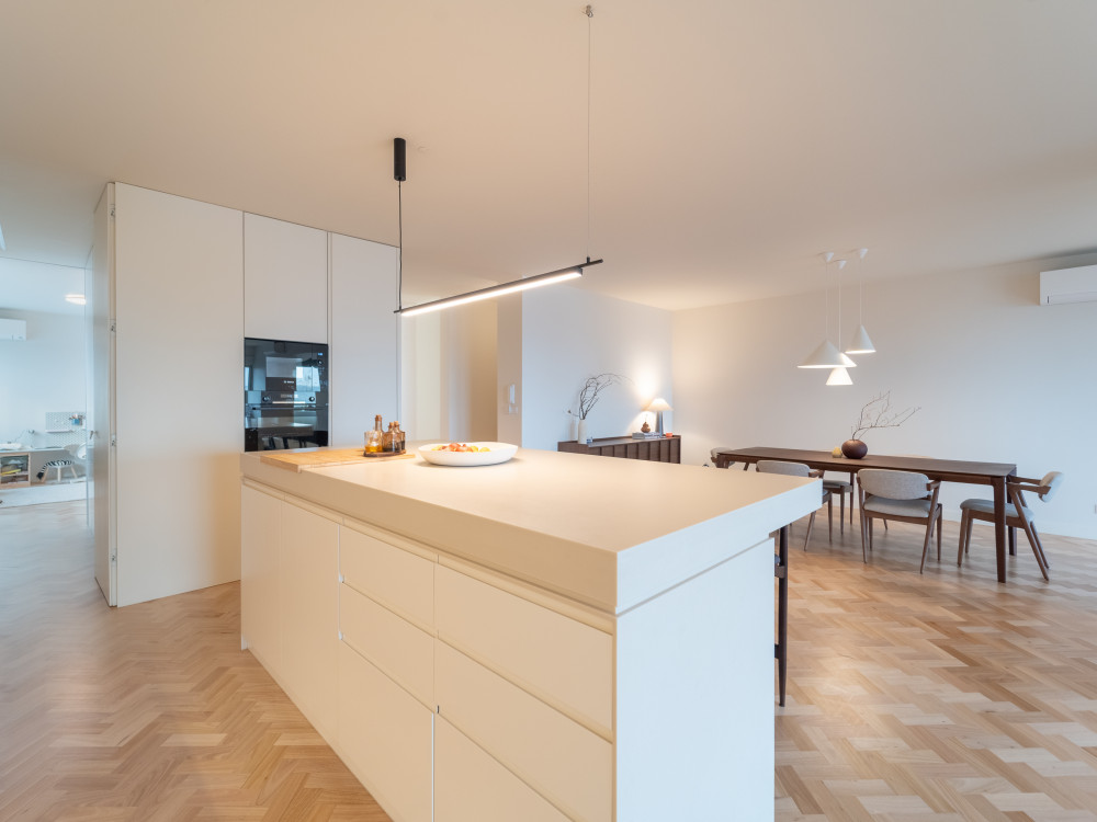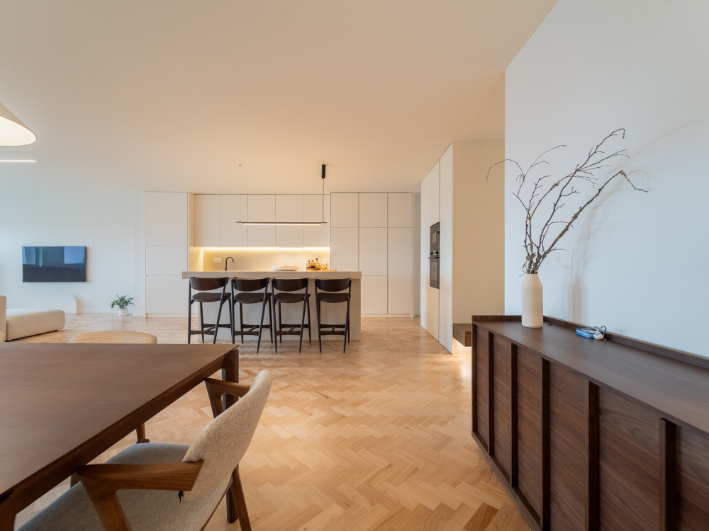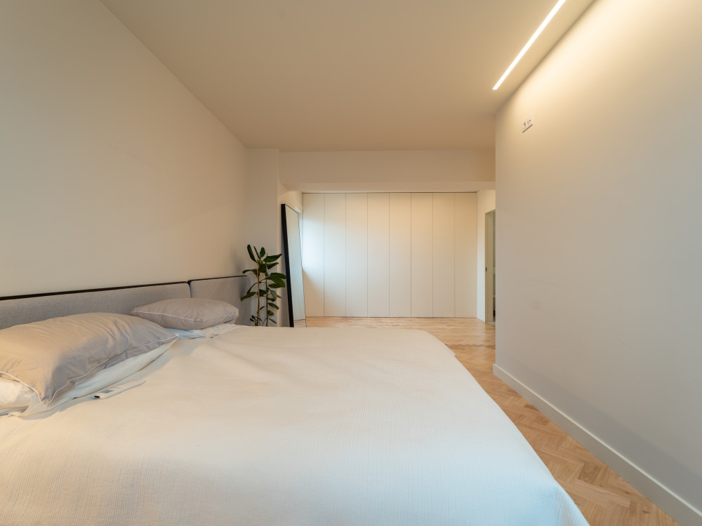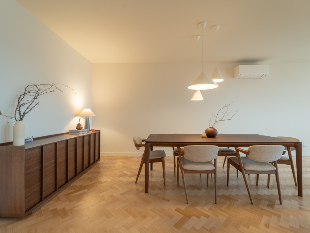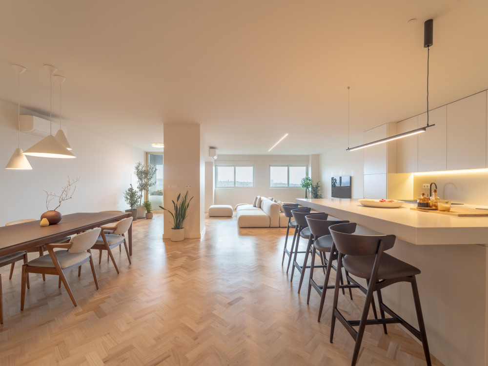 Originally a T5+1, the property was transformed into a large and functional T4, located on the 9th floor of a building with totally unobstructed views over the city of Porto. The social area is developed in a generous open space, where the living room and kitchen are integrated in a fluid way, creating a contemporary, bright and versatile environment. The flat also has four bedrooms, one of which is a very generously sized suite, ample storage capacity, independent laundry and a parking space.