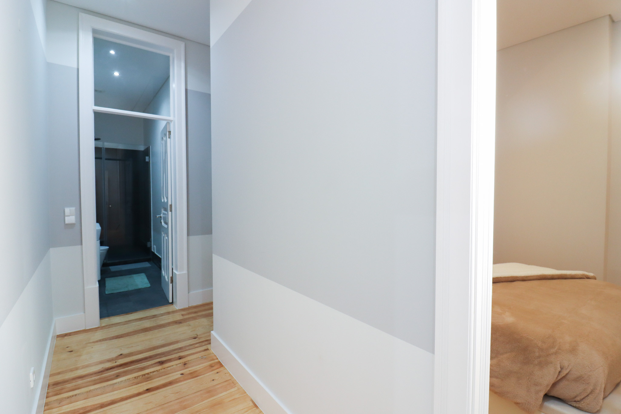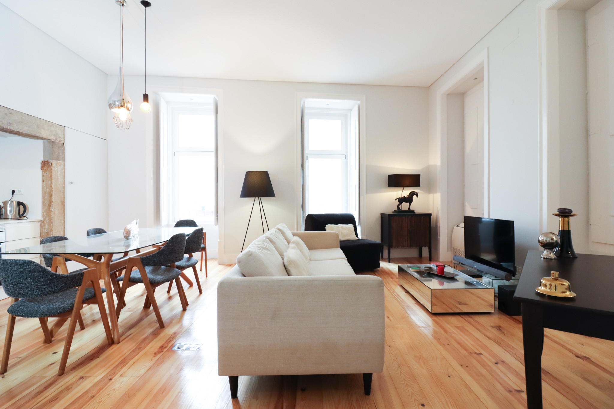 Set within a traditional Pombaline building, the property has been thoughtfully renovated while preserving original features, including hardwood flooring and wooden window shutters. The apartment is divided into two independent units, allowing flexible use as a private residence, rental investment, or a combination of both.