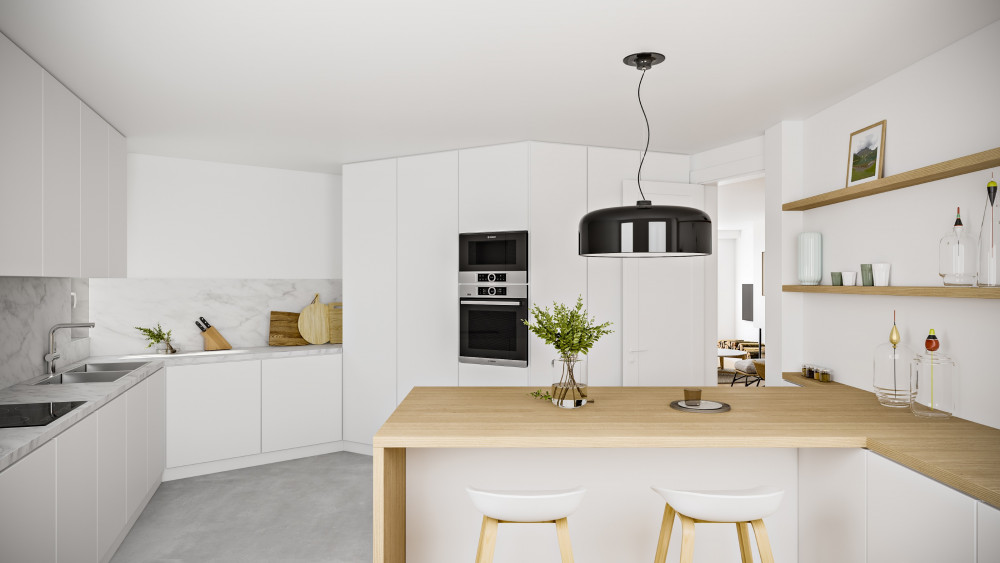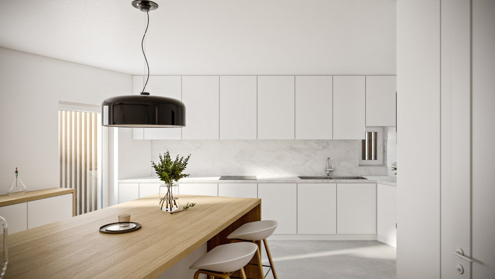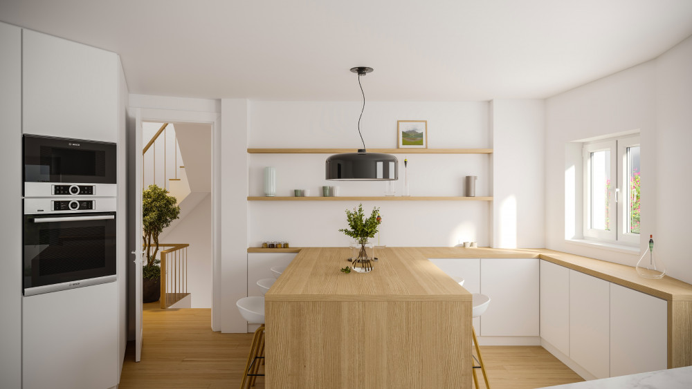 Spread over three floors, it is distinguished by the luminosity and intelligent organisation of the spaces. On the ground floor, the entrance hall leads to a large living and dining room measuring 45 m², with direct access to a 17 m² terrace that communicates harmoniously with the garden and swimming pool. The kitchen, with 24 m², is fully equipped with Siemens appliances, ensuring functionality and sophistication. This floor also has a guest bathroom.