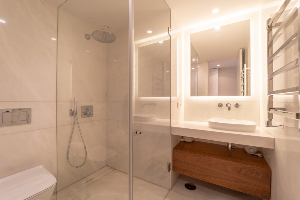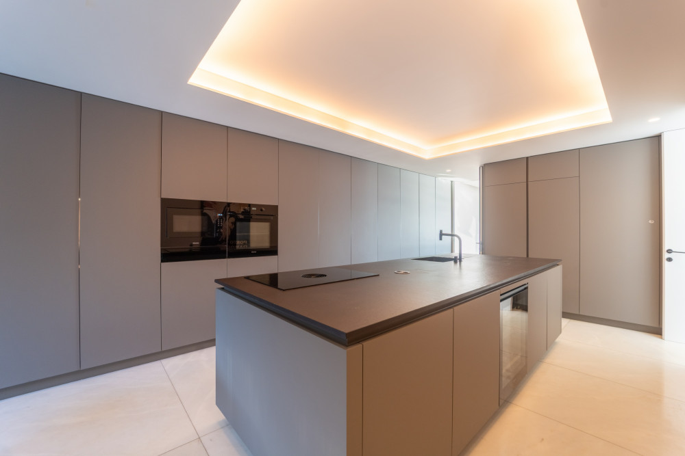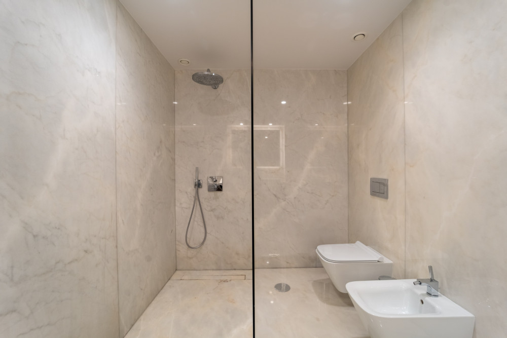 The private area comprises three bedrooms with built-in wardrobes and four bathrooms, all equipped with heated towel rails and modern finishes.