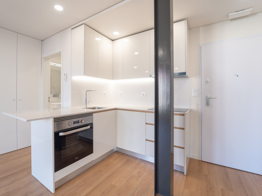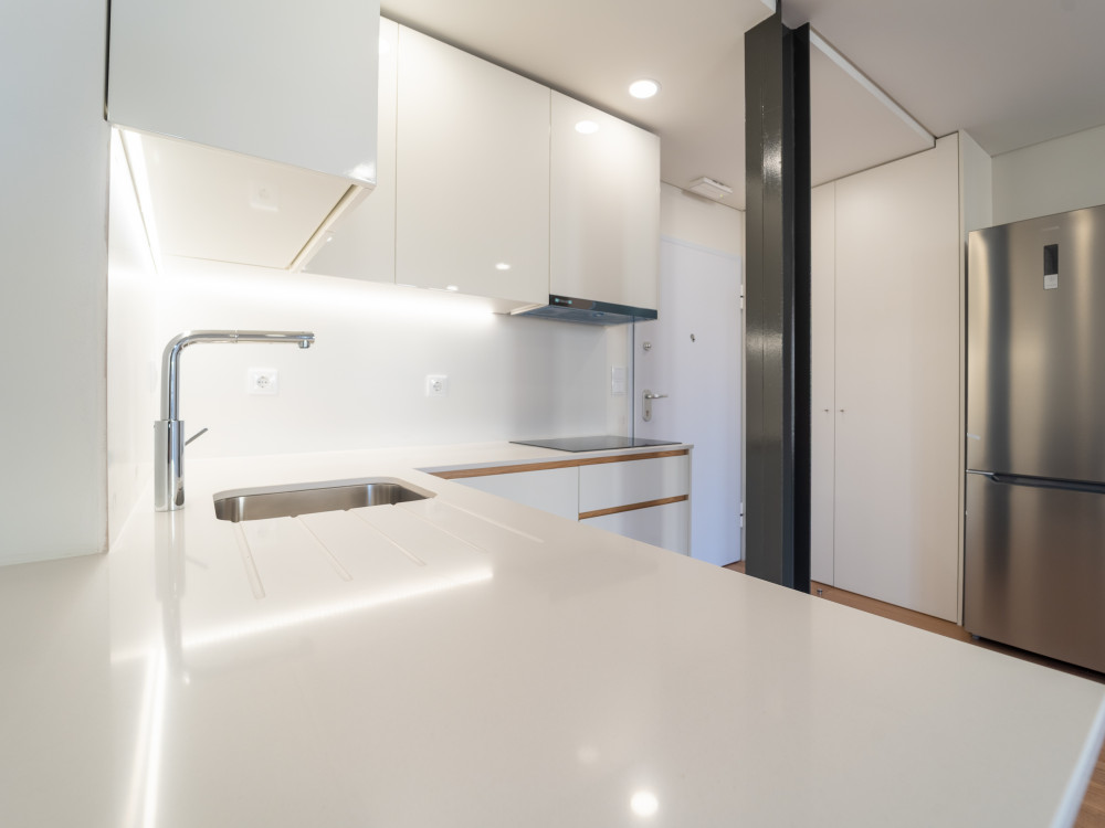 The flat has a large open space area, well organised and with excellent use of the areas, integrating the living room, the sleeping area and the kitchen. The kitchen is fully equipped, with hob, oven, microwave, extractor fan, fridge freezer and dishwasher, responding to the demands of modern daily life.