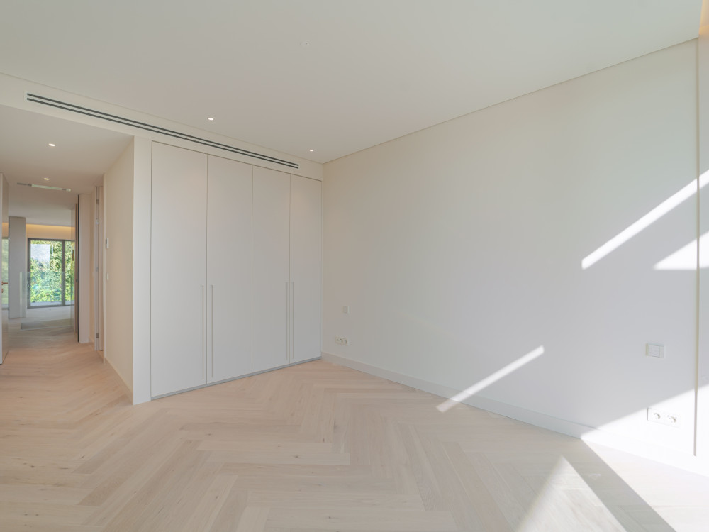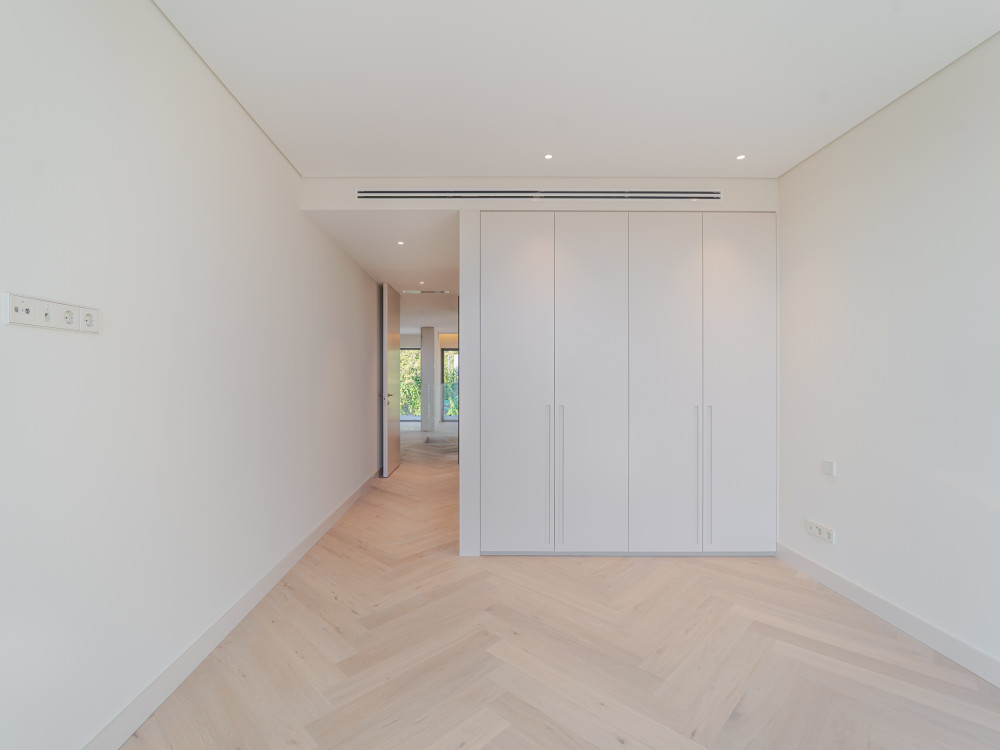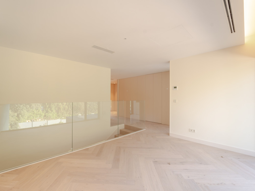 The interiors reflect a high standard of quality, with multilayer herringbone wood flooring, motorised interior blackouts, air conditioning with VRV system, crown moulding with integrated LED lighting, KNX home automation with control by digital applications, thermal solar panels, heat pump and hot water network with return, ensuring energy efficiency and total comfort.