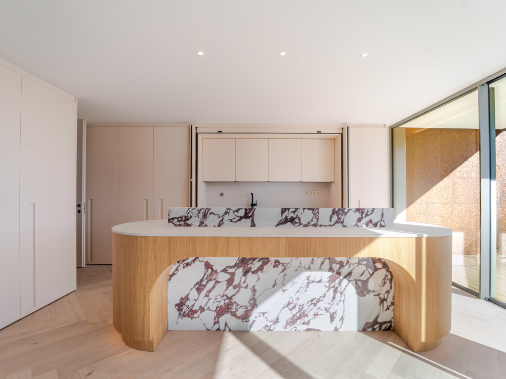 The uniquely designed kitchen combines aesthetics and functionality, and is fully equipped with Gaggenau appliances, induction hob with integrated exhaust, oven, dishwasher, fridge and side-by-side freezer. The central island, lacquered furniture and Dekton Moone tops elevate the culinary experience to a level of excellence.